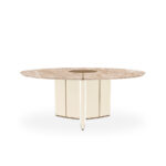 Algerone is an opulent round dining table, inspired by architectural elements, it was designed to remind us of the unique strength and class that only marble has. The light eperador marble circular top is supported by a sleek base adorned with beige leather and aged brass detailing. A design that will redefine the way you perceive dining tables.