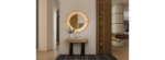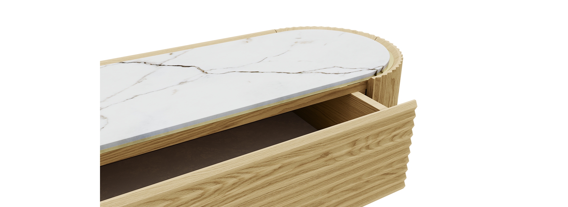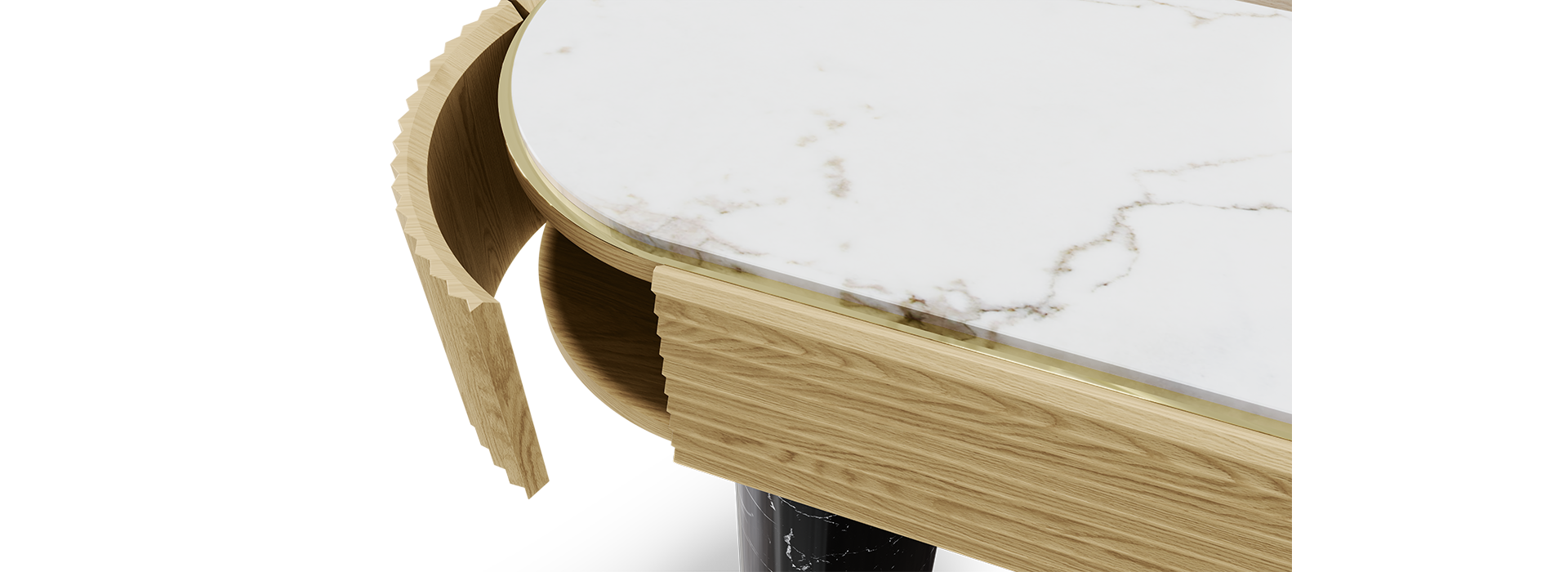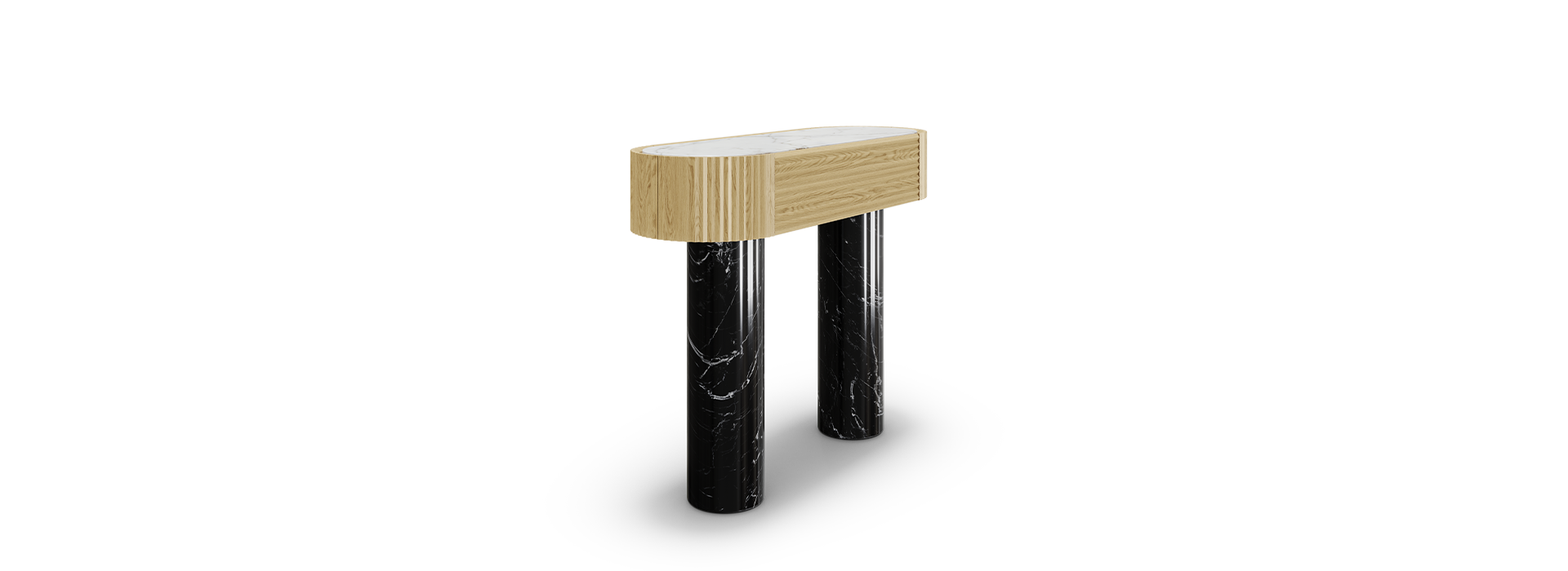 Consoles are versatile pieces that provide a surface without taking up too much space. Anjelica Console is a modern wood and marble console table that features one drawer for extra storage. Its sculptural form and high-end materials bring character and charm to a room, be it a modern hallway or entryway, or living room.
