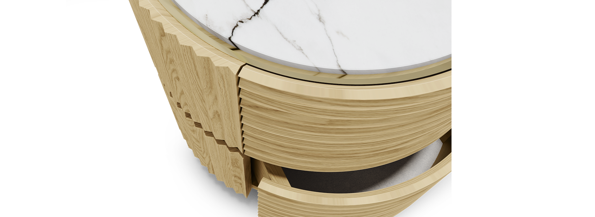 Polished Brass , Ash Wood with Matte Varnish , Nero Marquina Marble , Paris Cream Velvet , White Vogue Estremoz Marble |