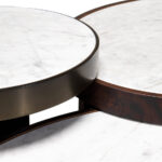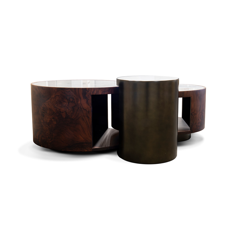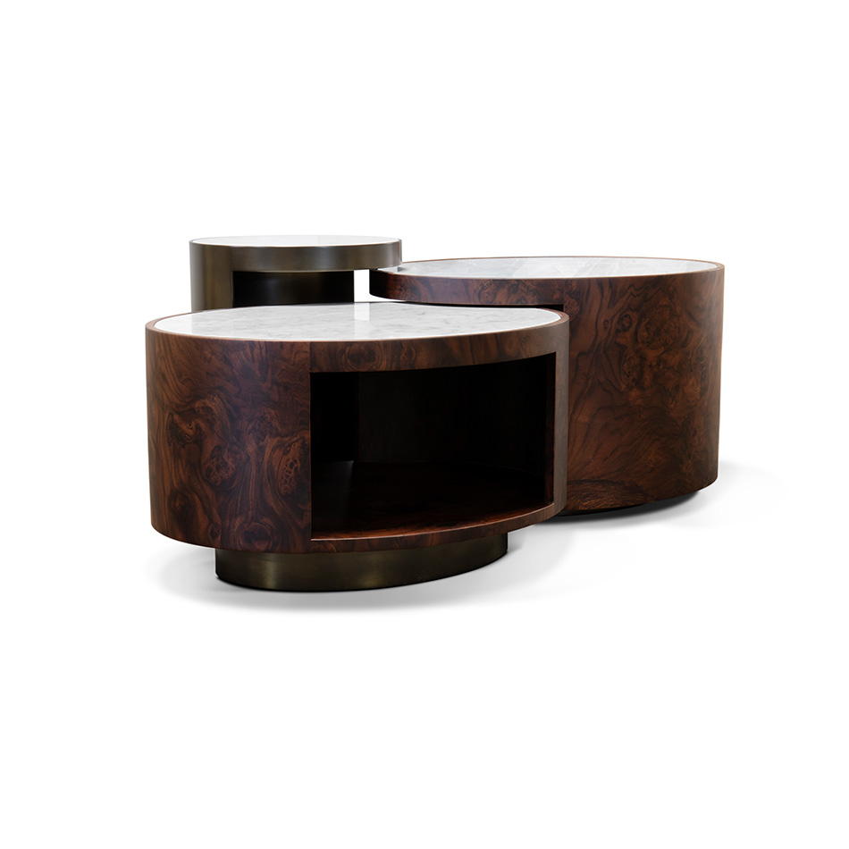 The circular shapes and round design of this elementary center table are inspired by the mountains surrounding the Guatemalan coffee plantation in Antigua City. The height of the mountains reaching the skies and emerging from the plains where some of the world’s best coffee beans are grown inspired the setting of the modular pieces for this item. With a walnut circular body and a carrara marble top, this modern center table besides presenting a versatile decoration assemble has also a fine inox dark bronze strip that provides it with a modern appeal. With a subtle space for storage, the three modular pieces can fit into every design aesthetic and be set in numerous combinations, providing an exciting and energetic vibe each time.
