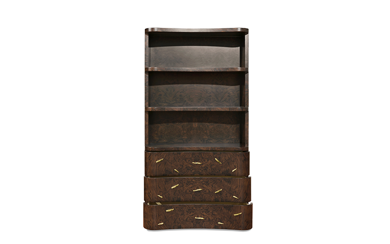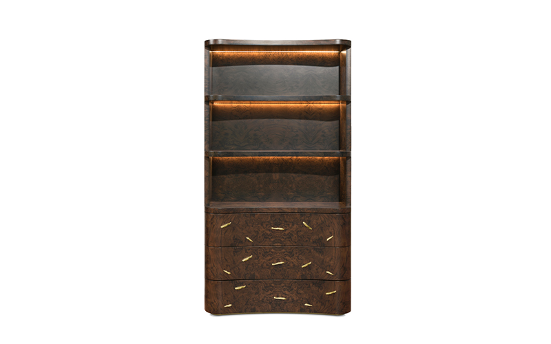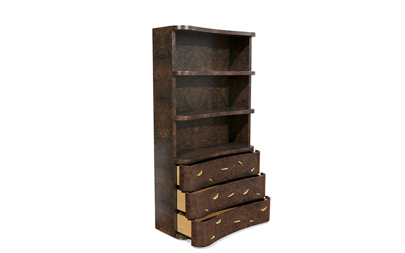 Baraka is an ancient Sufi word that means ”a blessing – the breath of life -, or essence of life” from which the evolutionary process unfolds. The BARAKA Bookcase has the main body structure in matte walnut root veneer covered with nature-inspired brass details; the base is in matte vintage brass and the interior of the drawers is covered in bird’s eye wood veneer. Charismatic by its never-ending contrasts between timeless and contemporary lines, this modern contemporary bookcase is the ideal choice for your modern interiors.