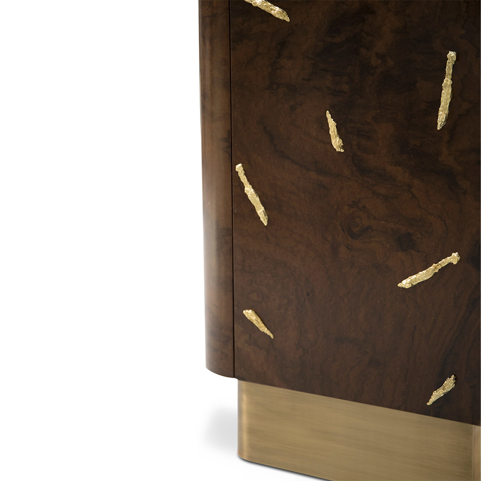 Baraka is an ancient Sufi word that means ”a blessing – the breath of life -, or essence of life” from which the evolutionary process unfolds. The spirit or BARAKA inspired the creation of this modern wood sideboard that has a strucure in walnut root veneer matte and polished brass details, with the interior in poplar wood veneer, shelves in smoked glass and a base in brushed aged matte brass.
