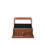 A discreet and practical bedside table with rough edges and vintage vibes. A solid wood body that contains a single large drawer at the bottom and a piece of wood frame on top of it, making for a perfect shelf and leaving an empty surface area, covered by stylish black leather, for decoration.