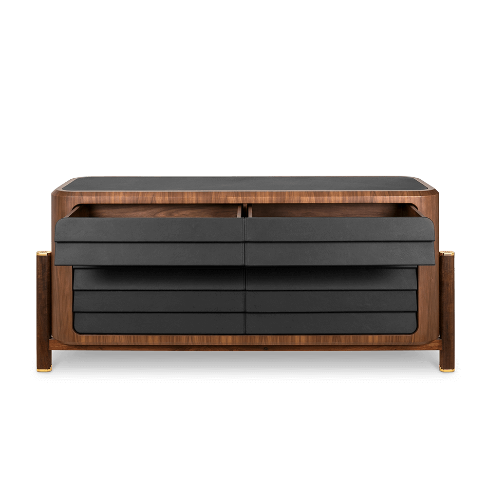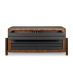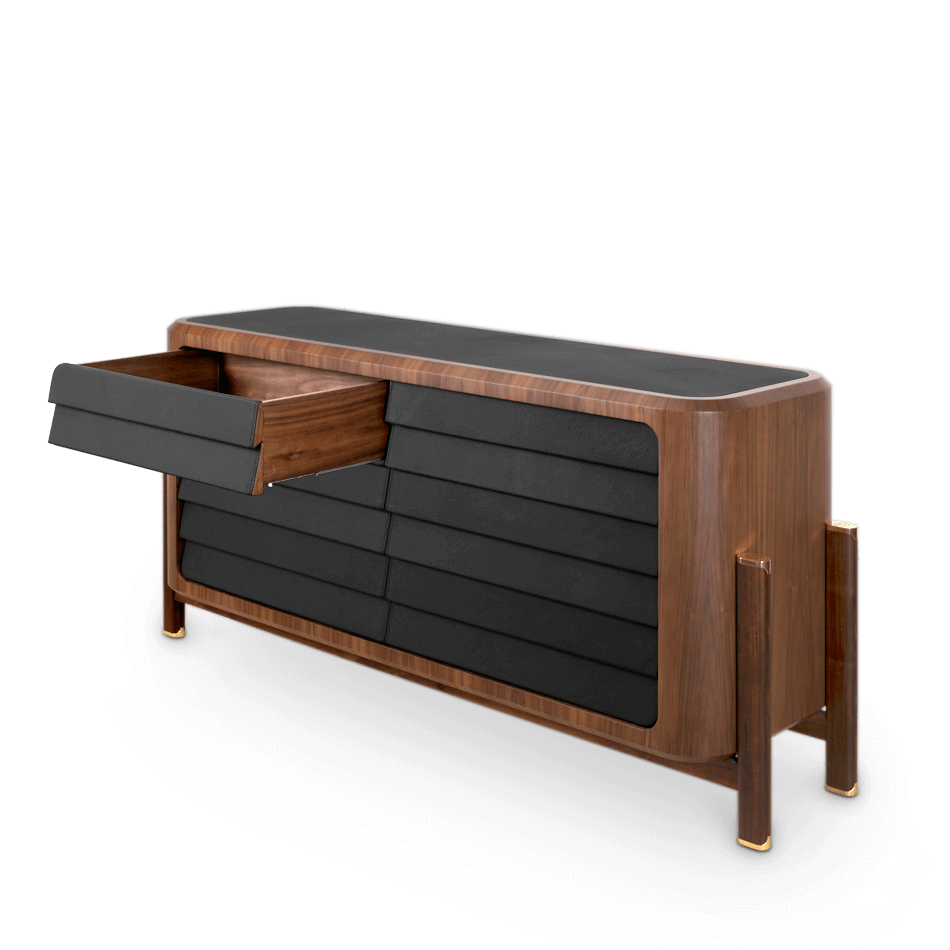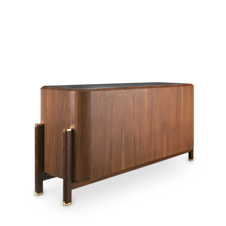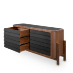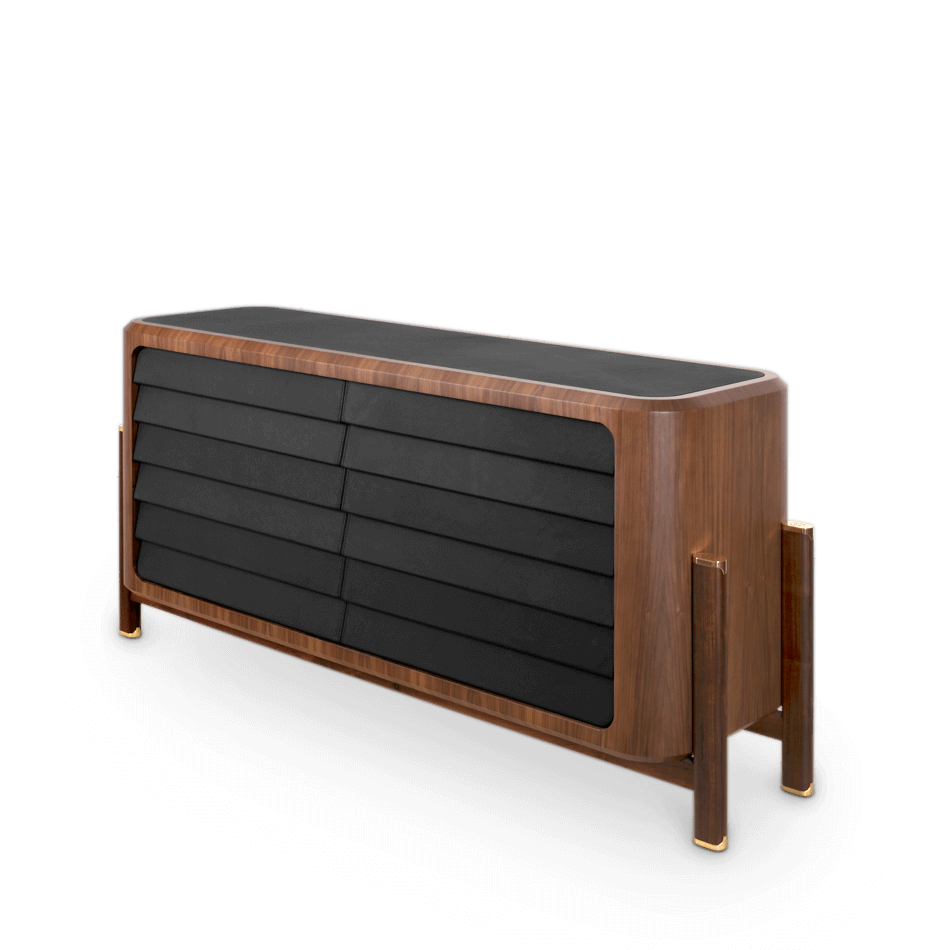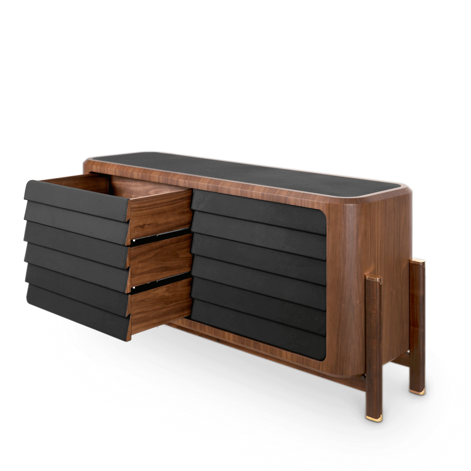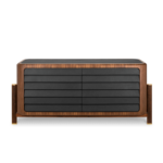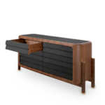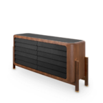 Introducing the Brando Sideboard, a discreetly stylish and modern storage solution. Its solid wood structure and dark fabric lend a sober and elegant appeal. Metallic details with the brand’s logo enhance its uniqueness. A perfect blend of mid-century and modern design, making it an iconic piece for your luxury living room decor.
