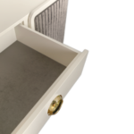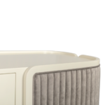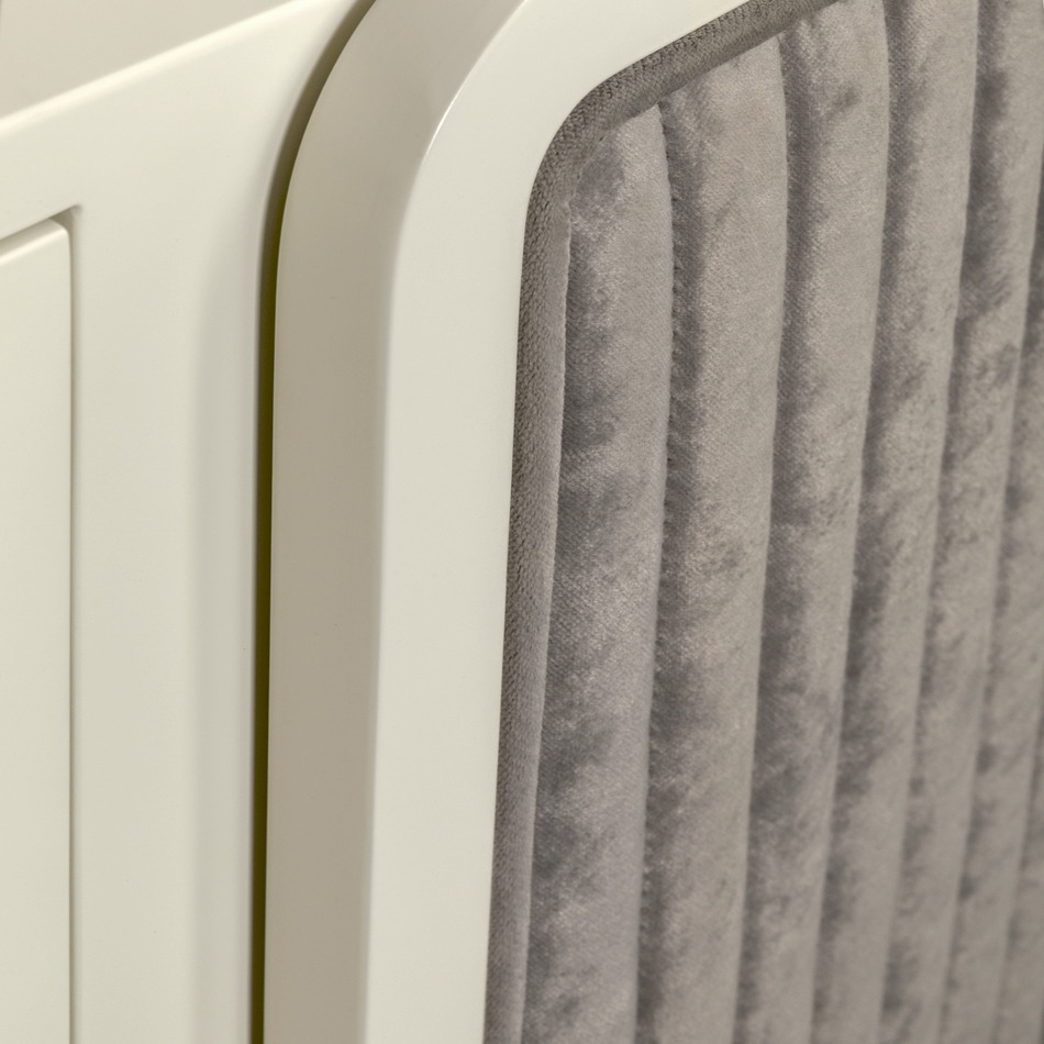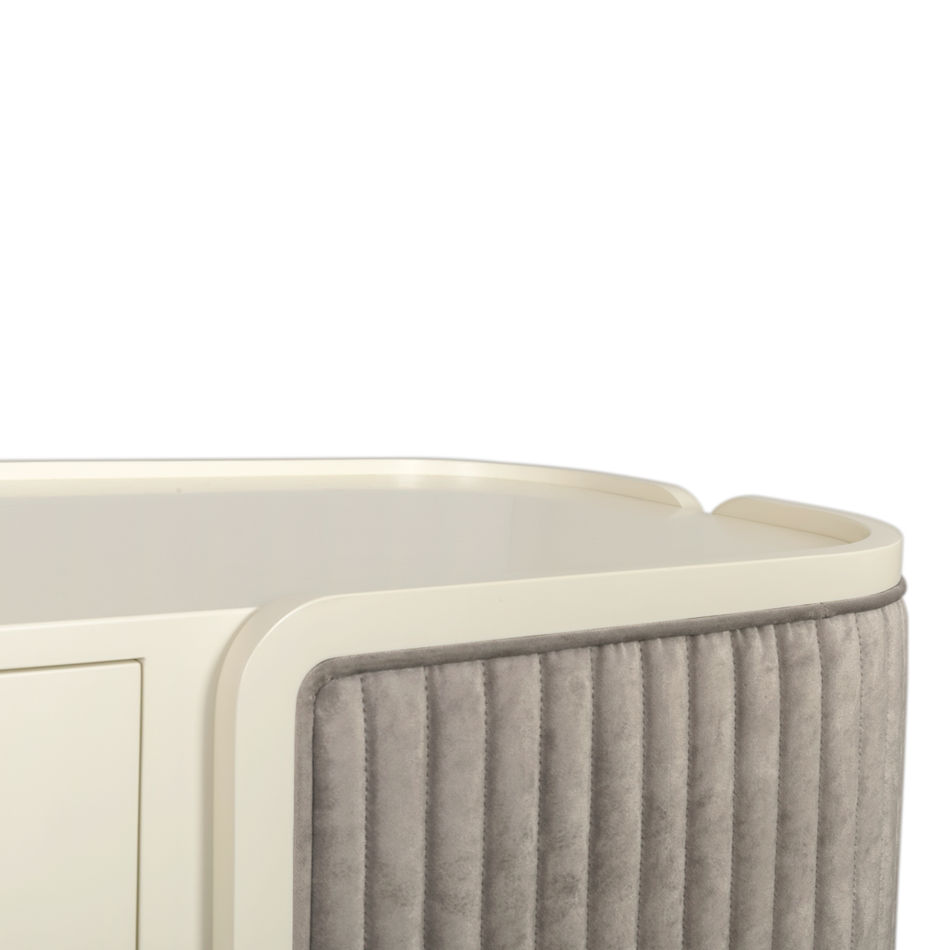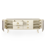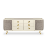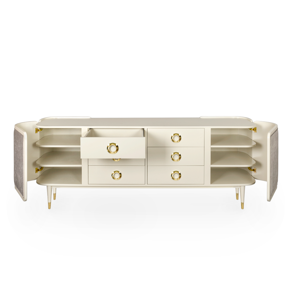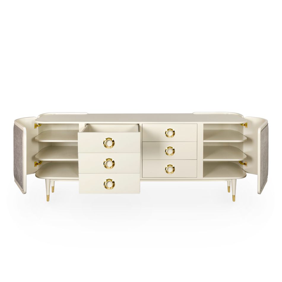 Get enamored with a new mix of luxury and mid-century: Davis sideboard, fusing luxury and mid-century allure. Lacquered wood, glass top, and upholstered details embody the essence of mid-century style. 6 drawers with metal knobs and velvet-coated doors offer elegant storage for any luxurious dining room. A perfect balance of modern and past design.
