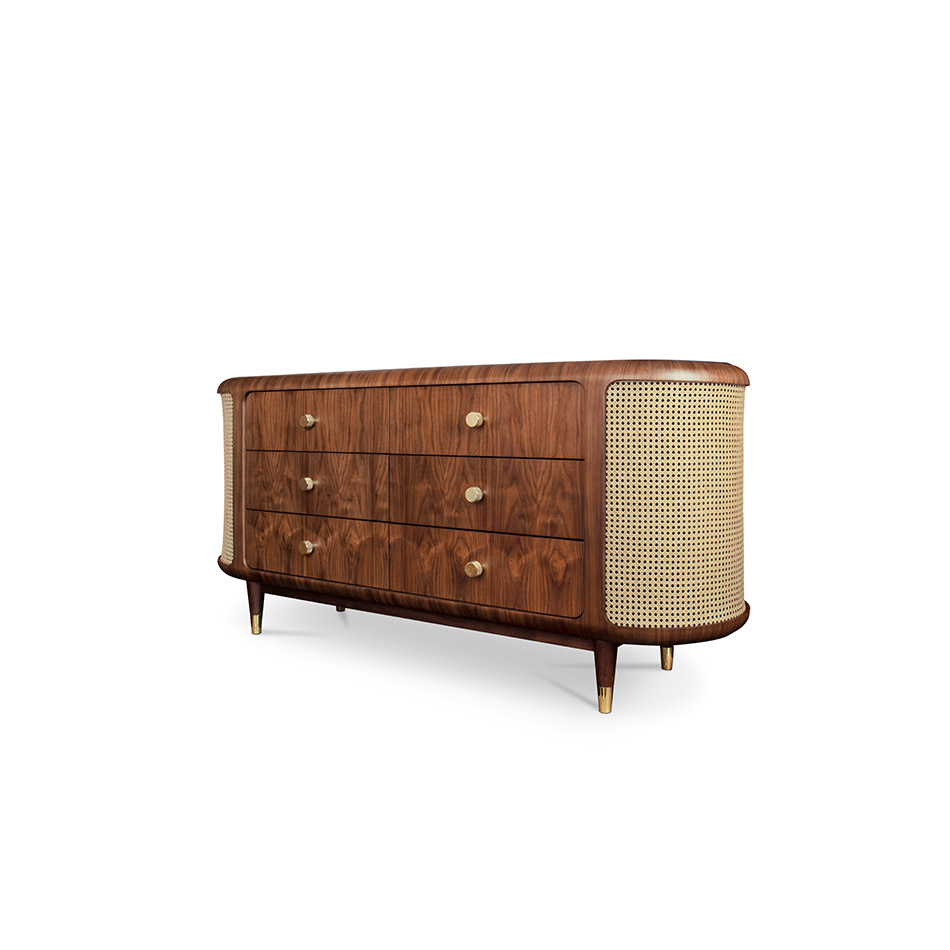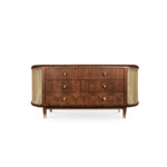 The Franco Sideboard pays homage to Scandinavian and mid-century design, captivating with its clean lines and solid wood structure. With a simple silhouette, legs featuring metal tips, rattan grills on the sides, and six large drawers, this sideboard is a true definition of Mid-Century Modern.