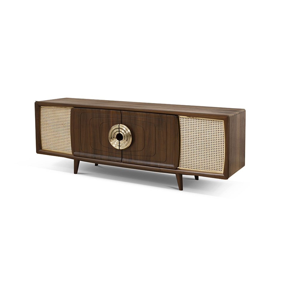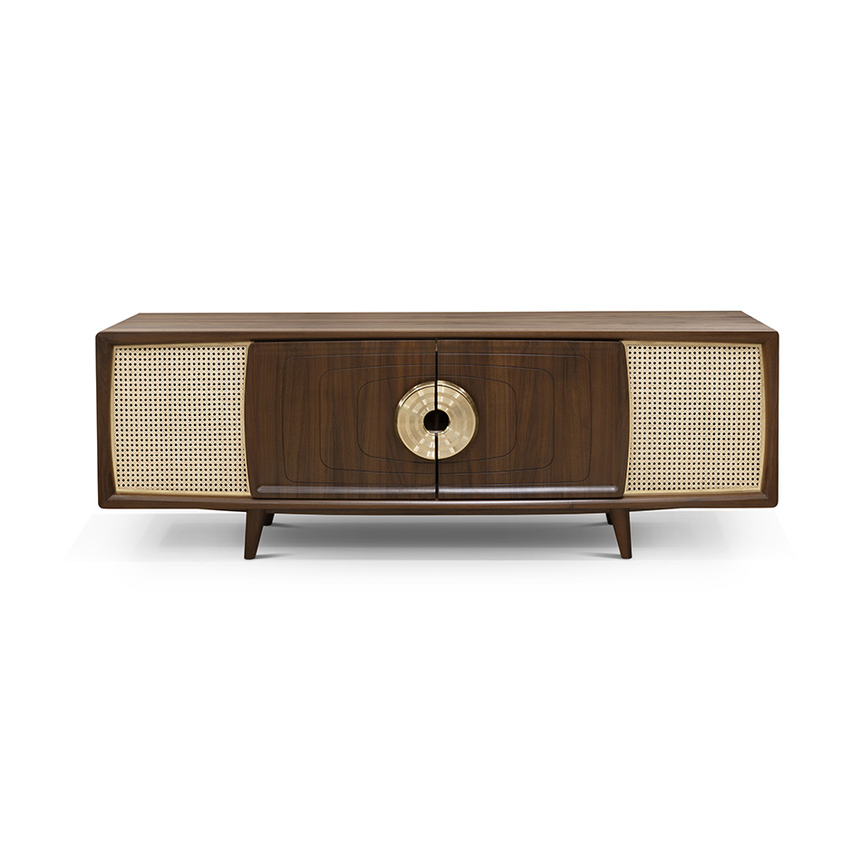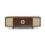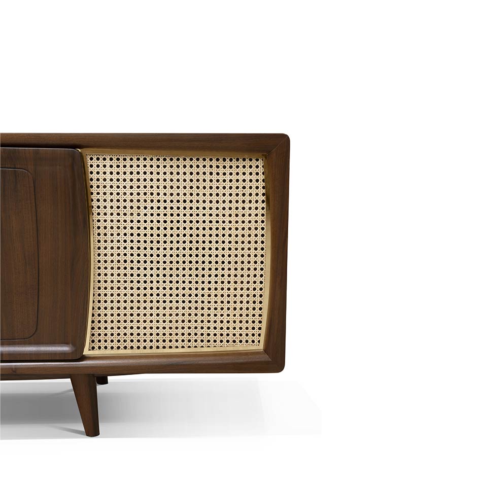 The Hendrix TV cabinet is a timeless mid-century piece crafted with clean lines, natural materials. Sophisticated like the mid-20th century aesthetic, it features rattan, wooden veneer, and metal details. Resembling a kitsch radio, with grill cloth on the doors and built-in bluetooth speakers, this is a vintage and functional statement piece.