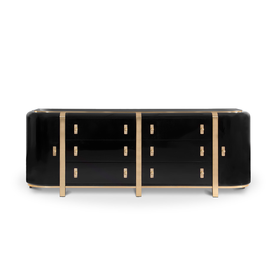 Kahn will bring a strong presence to your living or dining room with its mature look. A perfect piece for any luxury interior, Kahn surprises with a gorgeous high gloss varnish over its wooden body. Produced metallic trims laid out symmetrically to provide an overall sense of unity and form, this sideboard mixes durability with elegance and luxury.