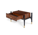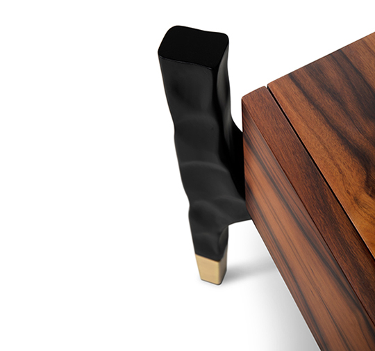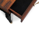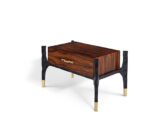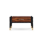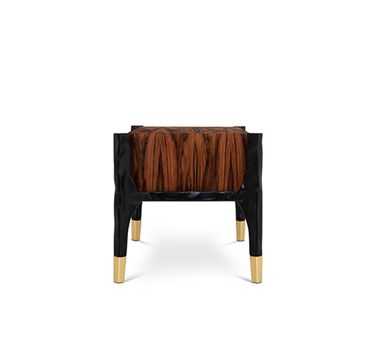 LANKA Bedside Table is inspired in a traditional method practised in Sri Lanka, the stilt fishing, now disappearing. The vertical poles embedded into the sea floor are the main reference for the structure of LANKA: in matte black lacquer, it supports the main body covered in matte palisander wood veneer, and with matte brass details. This bedside nightstand is an elegant choice for a bedroom in a residential or hotel project.