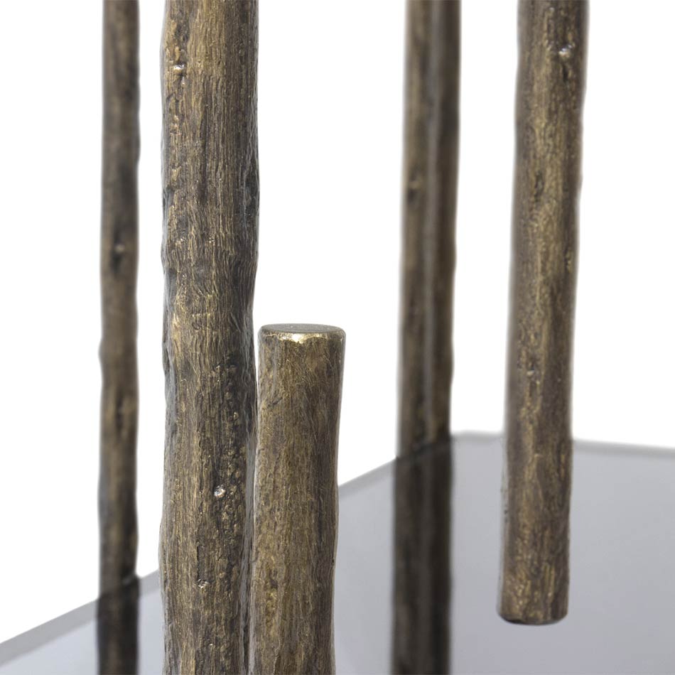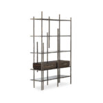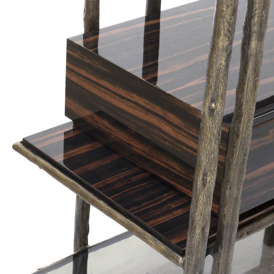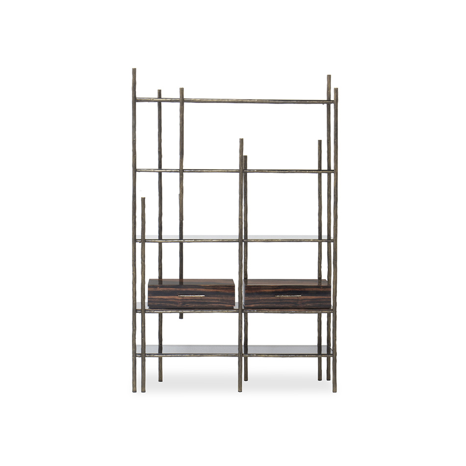 A quick look at MAMBU Bookcase and you can identify the inspiration behind it. Bamboo is tall woody grass and it inspired the structure of this unique bookcase made in patina Brass. It features four spacious shelves in smoked glass and two drawers in ebony wood veneer with a glossy varnish. This modern bookcase is the perfect addition to any office decor or modern living room.