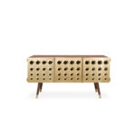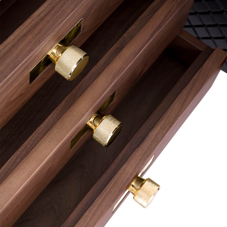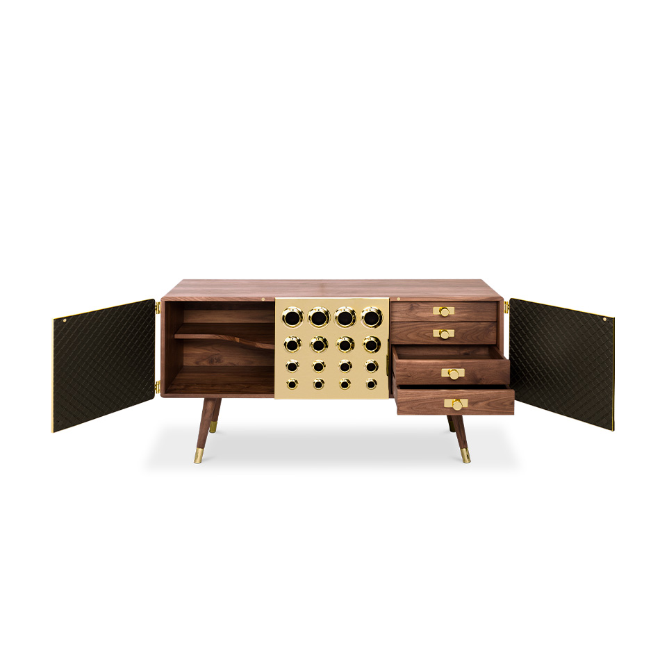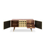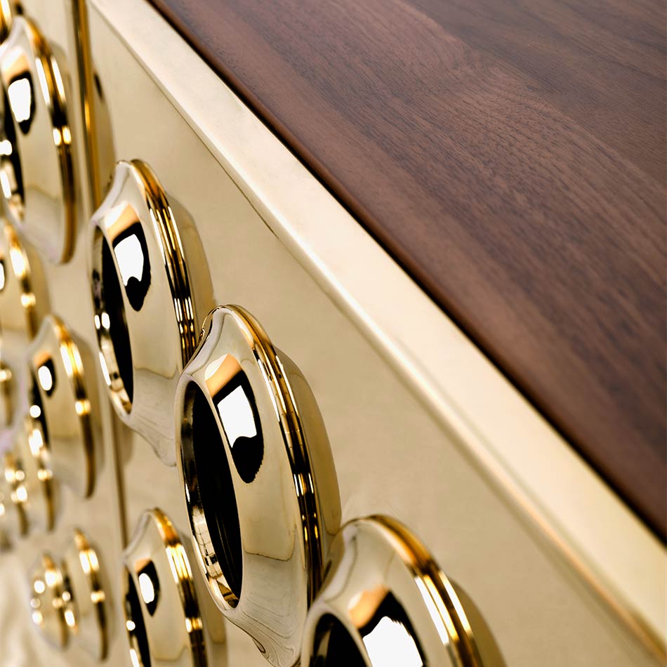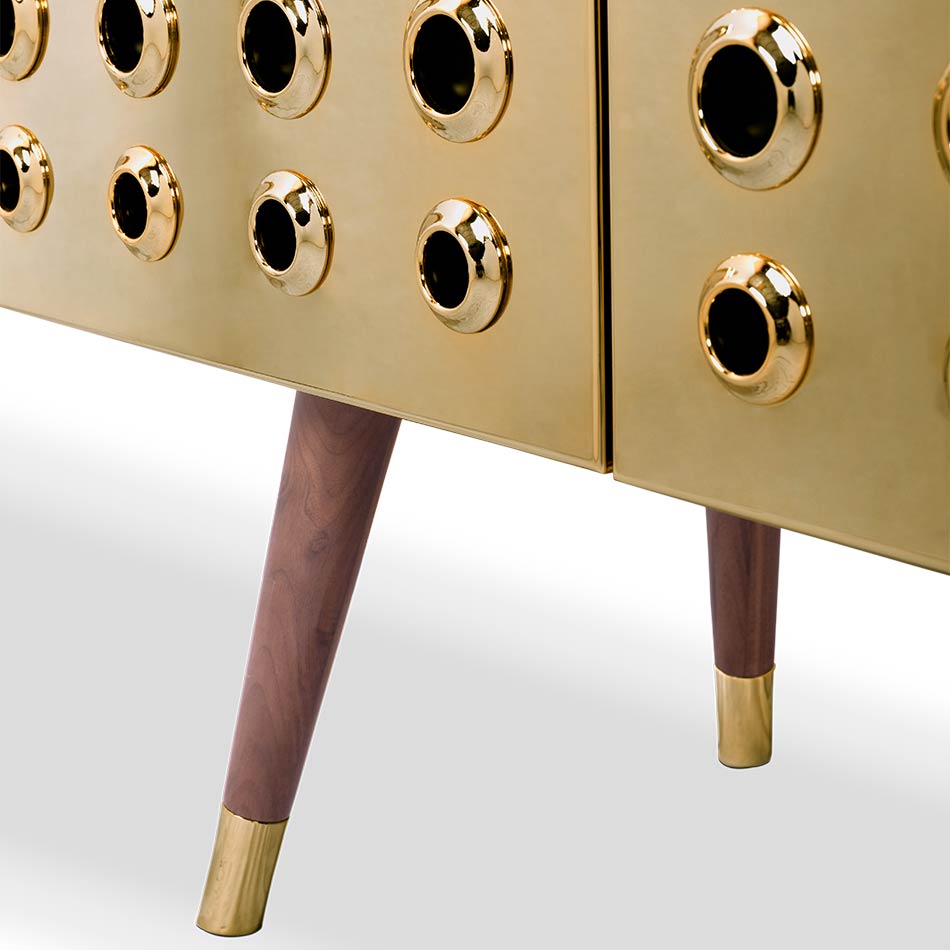 Monocles is a charming and luxurious furniture piece with a strong mid-century appeal. Its metal doors and engraved circles on the wood structure create a unique and characterful design, inspired by the iconic gun barrel scene from the Bond movies, making it a perfect choice for retro and mid-century enthusiasts.
