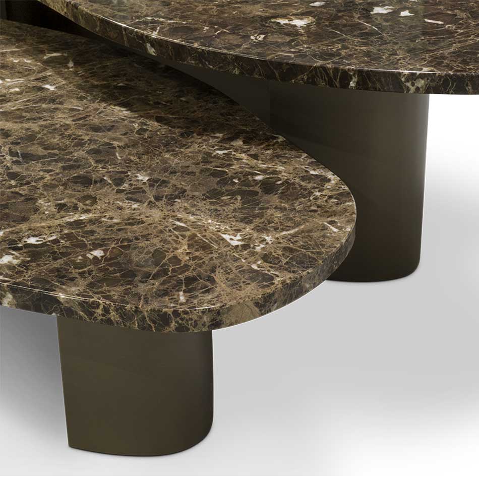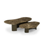 With an uneven shape, taking inspiration from the disformity of the sub-Saharian plains where the famous Coffea Robusta is grown, this center table has both a soft yet eye-catching presence. Its two marble tops resemble the hues of brown from the exquisite coffee beans and rest perfectly on a delicate and continuous bronze leg. The perfect piece to provide a simple and neutral complement to a modern interior.