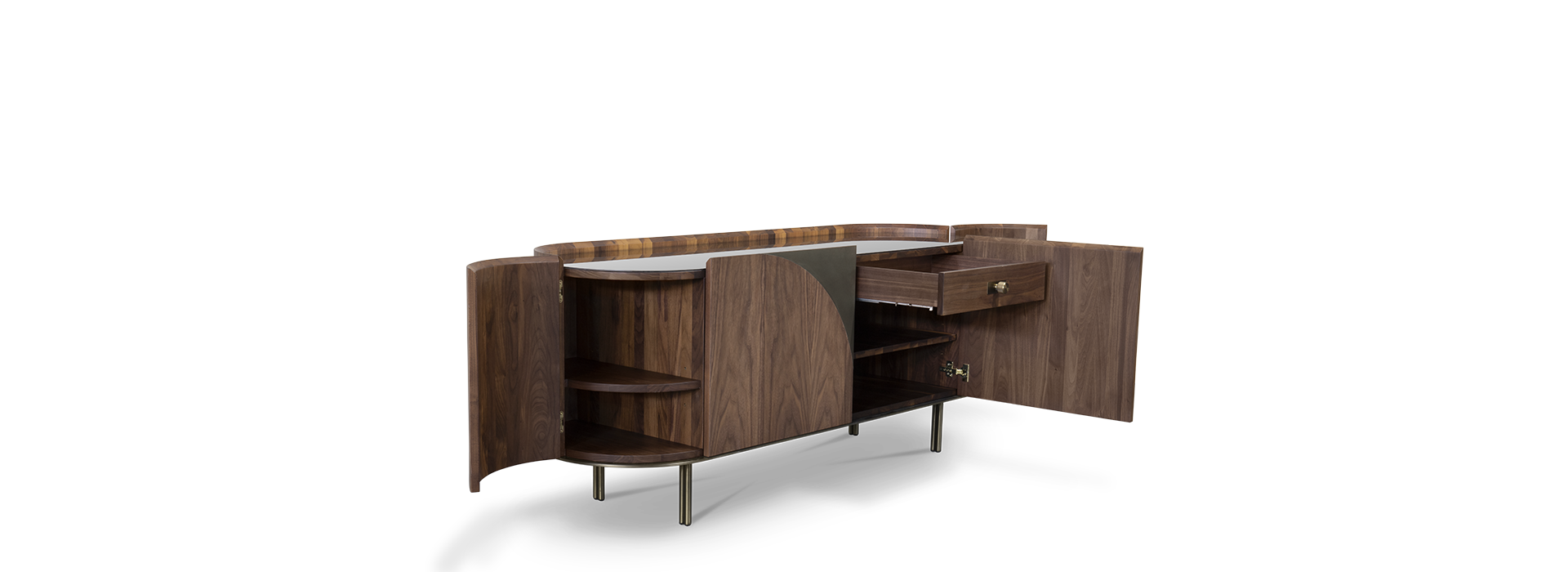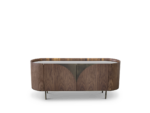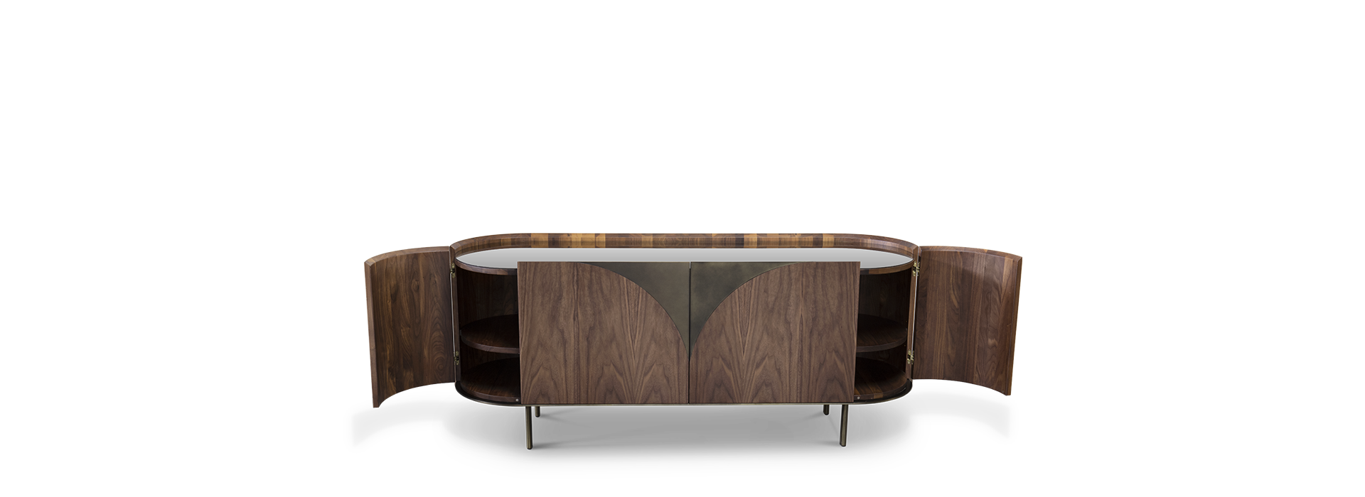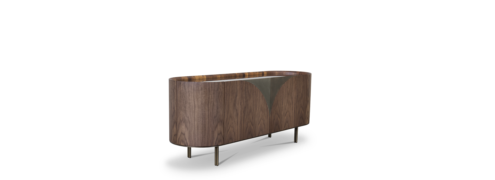 Modernistic and sophisticated, the triangular epoxy dark bronze shapes on both doors for this modern sideboard, reflect the erupting volcano that formed the Sulu Archipelago, home of the Kahawa Sūg, or Sulu coffee, a variety with a unique origin. This chic sideboard shares a similar creation, a robust rounded walnut veneer matte body with a refined bronze glass top, creating a perfect balance between the materials, without diverging from its inspiration and without compromising its beauty in any room or setting.