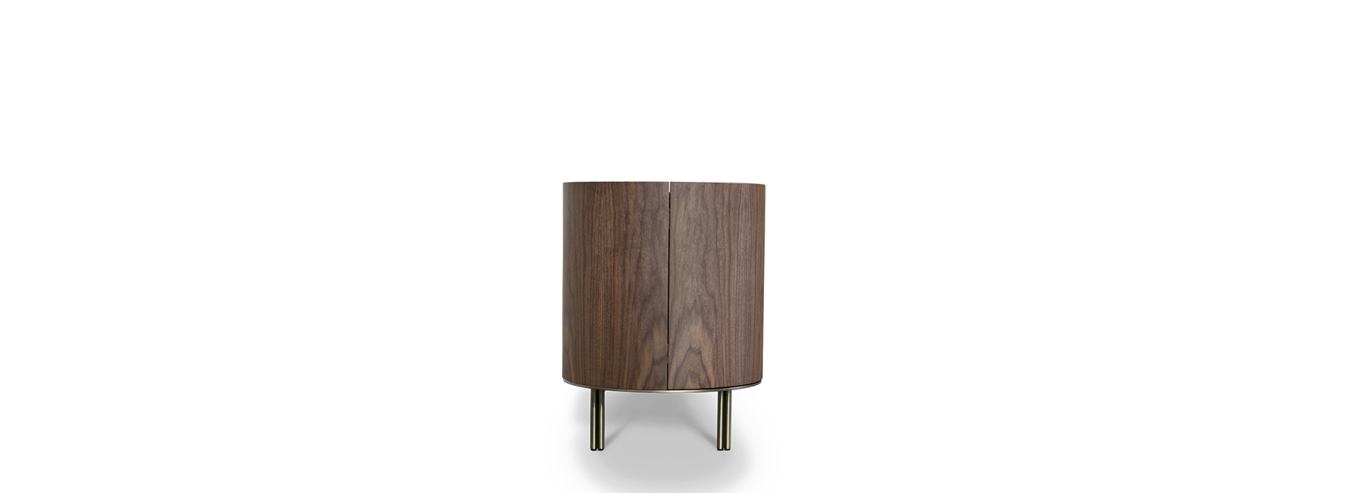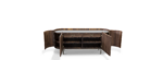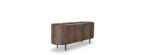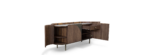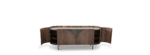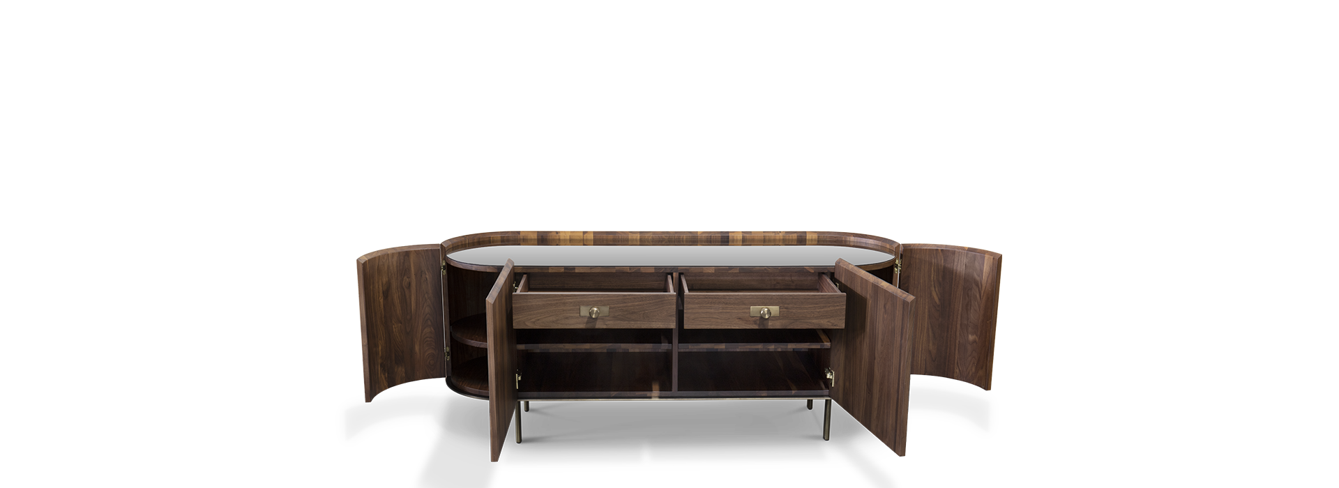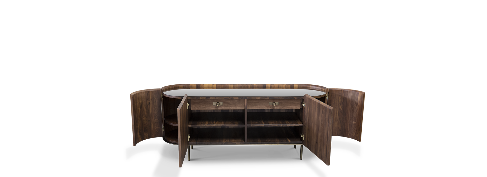 Modernistic and sophisticated, the triangular epoxy dark bronze shapes on both doors for this modern sideboard, reflect the erupting volcano that formed the Sulu Archipelago, home of the Kahawa Sūg, or Sulu coffee, a variety with a unique origin. This chic sideboard shares a similar creation, a robust rounded walnut veneer matte body with a refined bronze glass top, creating a perfect balance between the materials, without diverging from its inspiration and without compromising its beauty in any room or setting.