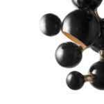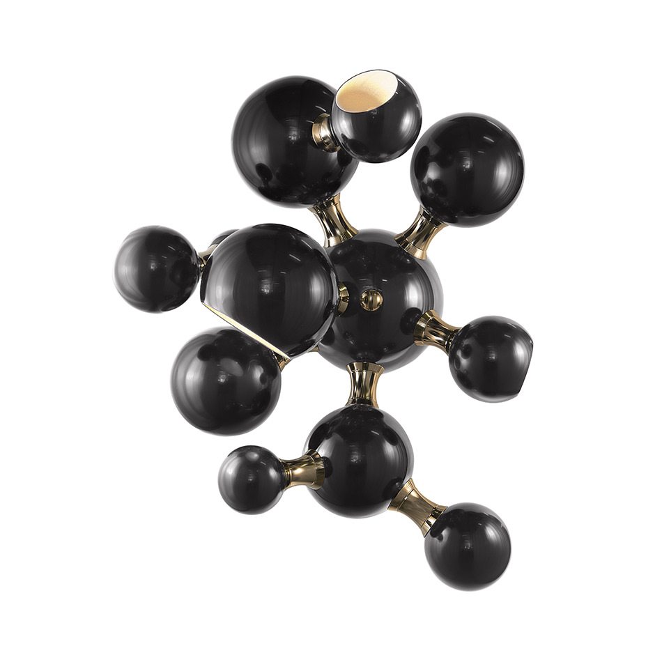 Atomic wall light is a mid-century modern lighting design inspired by the atomic discoveries of the mid-20th century. With multiple round shades that resemble the molecular composition of the atom, this interior wall light can give a fun twist to a contemporary home decor. Its body is handmade in brass and steel, with both a glossy black and a gold-plated finish. The lamp shades feature a glossy black lacquer on the exterior, while gold powder paint is used for the interior shade. It is with a modern vibe that this indoor wall light creates a statement of mid-century modern design in a contemporary living room, displaying each detail as a faithful reproduction of the glamorous 1950s.