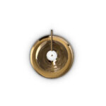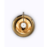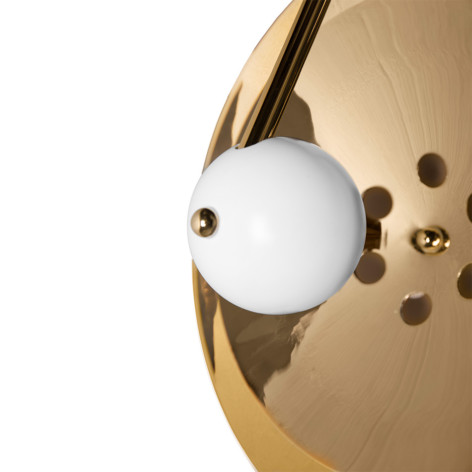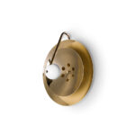 Basie wall light fixture is a modern representation of the sci-fi aesthetics of the 1960s. The vintage mid-century lamp has a set of distinctive features which make it a stunning statement piece. It is an indoor wall light handmade in brass, with a center shade made in aluminum and a mesmerizing gold-plated standard finish. The lamp shade is lacquered a glossy white for a more modern look. Being the sleek and sophisticated piece that is is, it works beautifully as a decorative wall light in any contemporary entryway or living room.