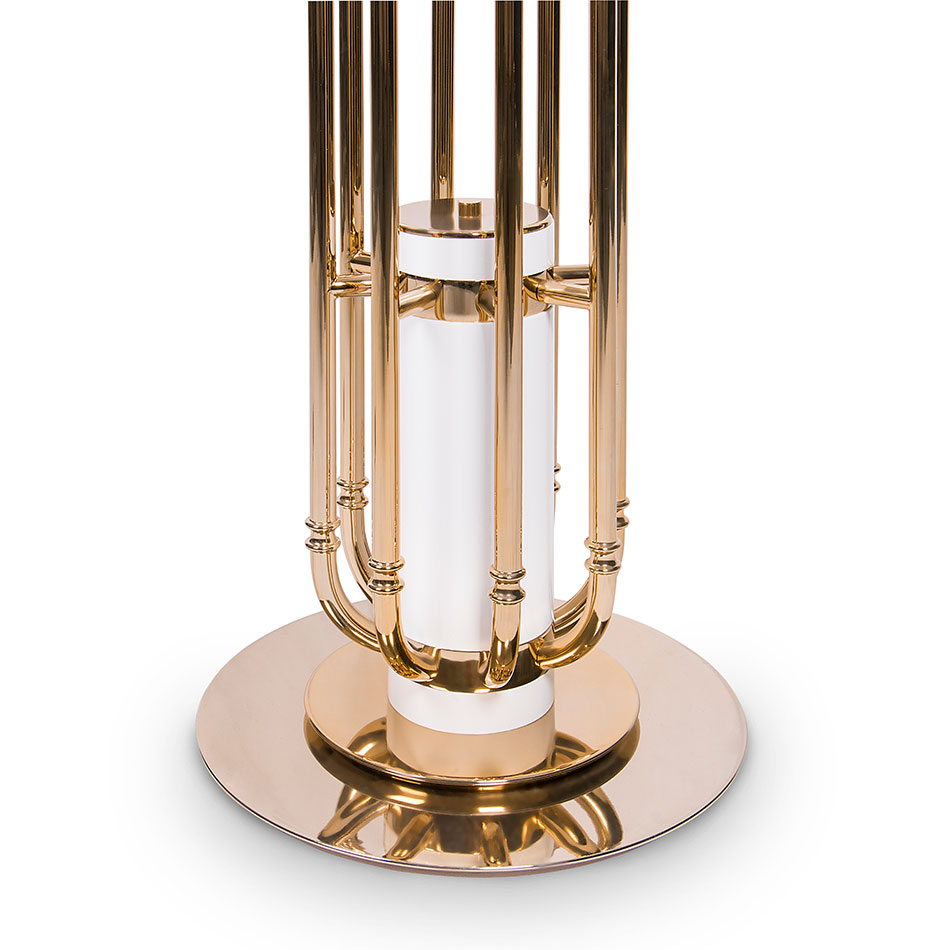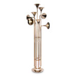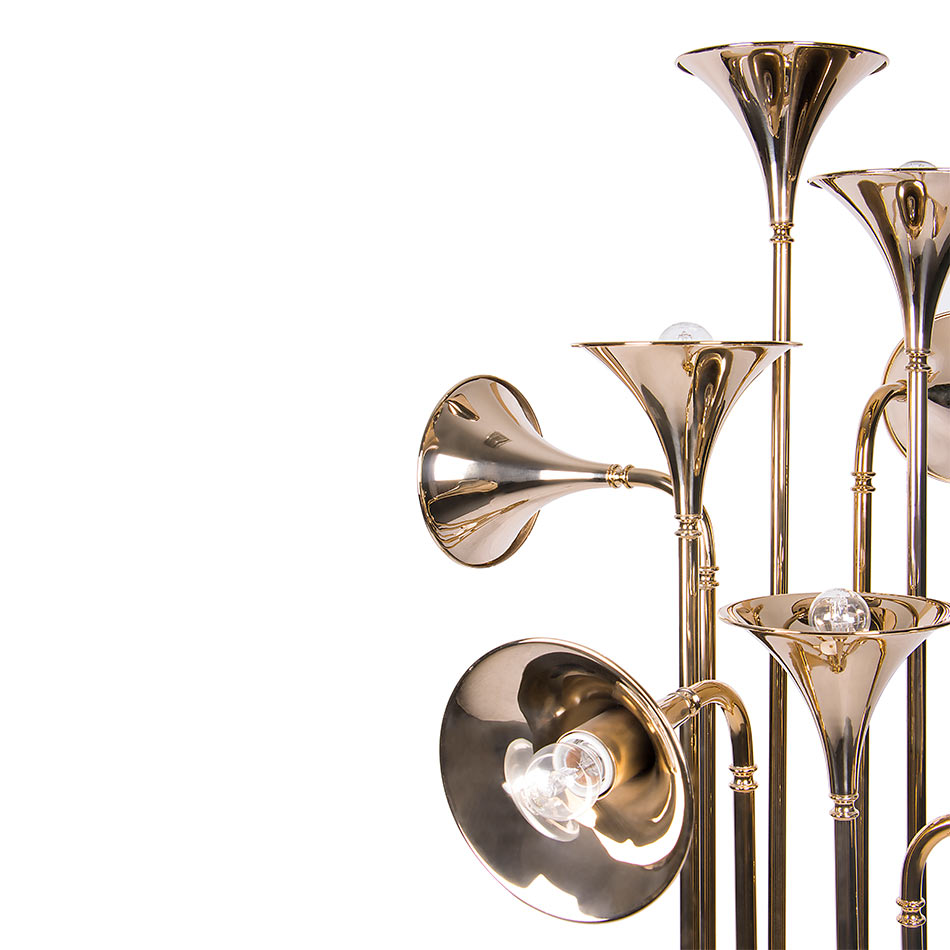 Botti floor lamp was inspired by the jazz musician of Chris Botti. The mid-century floor lamp is handmade in brass with a gold plated finish that reminds of a real trumpet due to its unique shape. With an aluminum base, this modern floor light can be customized in marble, giving an even more luxurious design to your mid-century modern interior. This brass floor lamp has eight spotlights which offer a soft lighting and goes as tall as 70,9 inches. Botti art deco floor lamp showcases a high-quality craftsmanship, that will definitely make a statement in your sophisticated classic living room design or mid-century hotel lobby. Botti contributes a jazzy and mid-century vibe as does the gold plated and white glossy finishes.