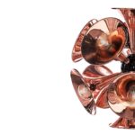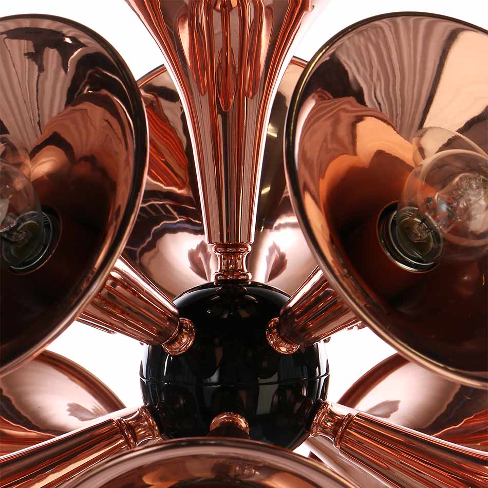 Inspired by the american trumpet player Chris Botti as a tribute to jazz music, Botti pendant lamp is a slightly smaller version of the modern chandelier with 15 trumpet-shaped shapes that stretch out from the center, creating a perfect sphere. It is handmade in brass, covered in a gold-plated finish. The round base at the center of the suspended light is handmade in aluminum and lacquered a glossy black, but it can also be lacquered a glossy white to meet the needs of the most exquisite sets. With a retro vibe, this art deco suspension lamp is best suited for a vintage living room, or mid-century modern bedroom.