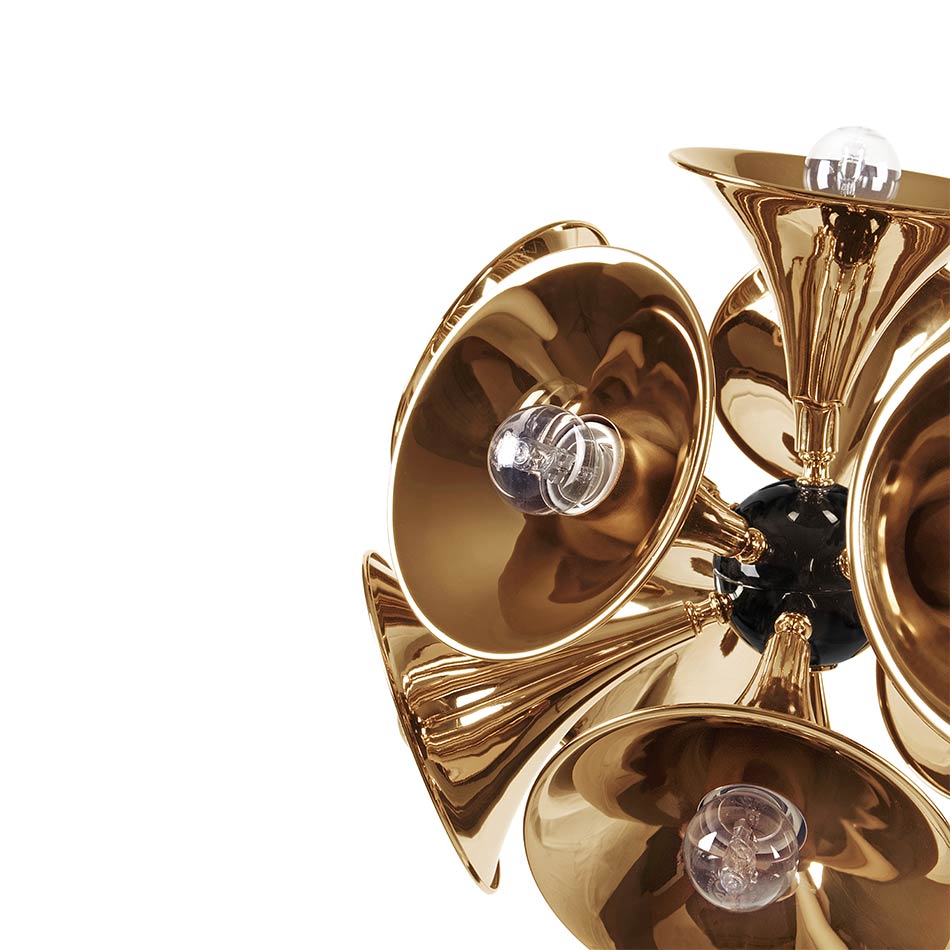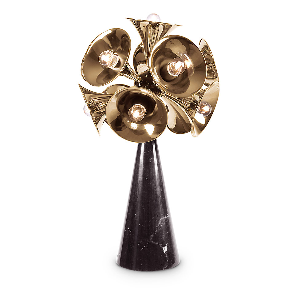 The embodiment of the most famous wind instrument of them all, Botti mid-century table lamp was inspired by a classic trumpet. Its unique shades are handmade in brass with a gold-plated finish to resemble a real trumpet. The base can be produced in Nero Marquina or white marble, as well as black nickel or any other finish of your choosing. It is a tall table lamp, very hard to miss, with almost 55 pounds, making it the ideal choice for a classic living room design. This vintage brass table lamp will definitely make a statement in your luxurious home.