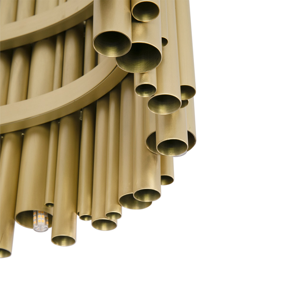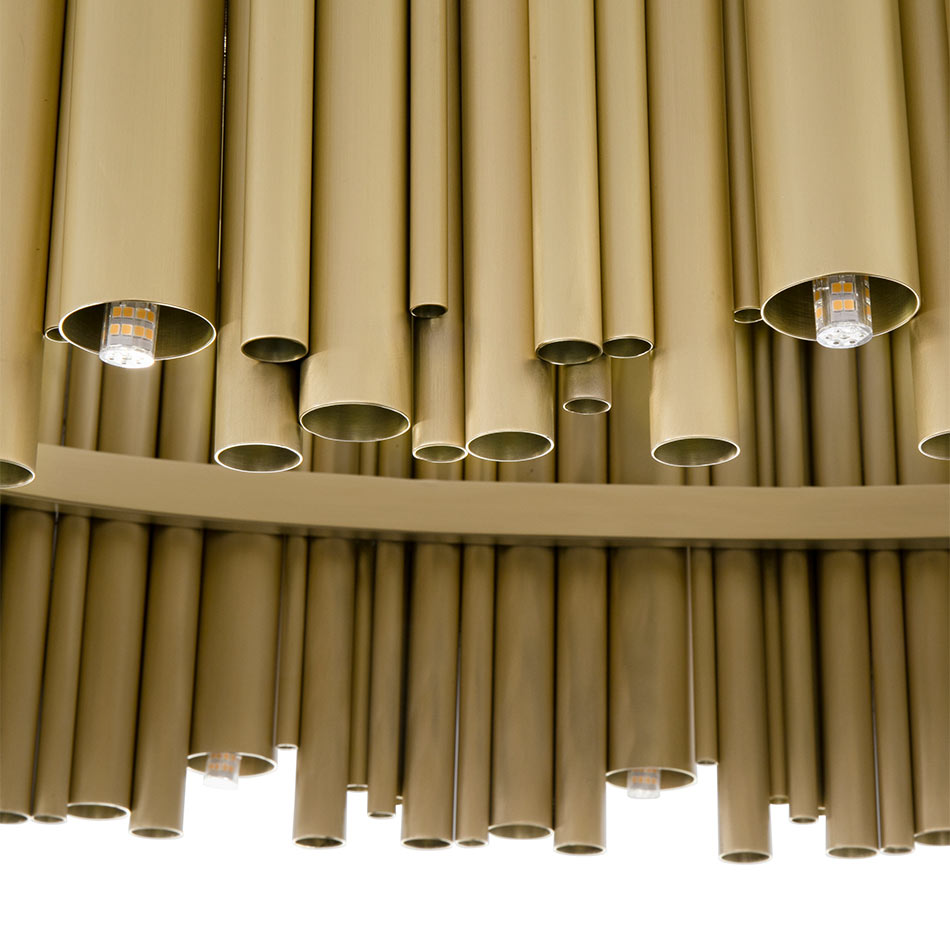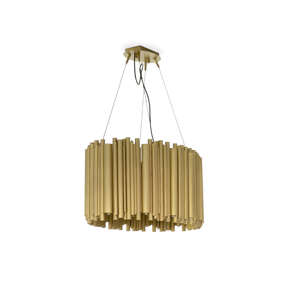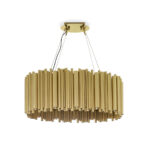 Brubeck mid-century modern chandelier is inspired by one of the foremost exponents of cool jazz: Dave Brubeck. This unique lighting design represents the sophistication and finesse of the American jazz pianist, displaying a very luxurious feeling. DelightFULL’s skilled artisans handmade this round chandelier in brass, covering it with a gold-plated finish, which can be customized in multiple other finishes. The result of this outstanding creation is a functional dining room chandelier with sculptural shapes.