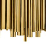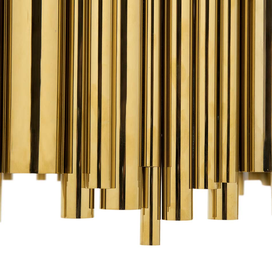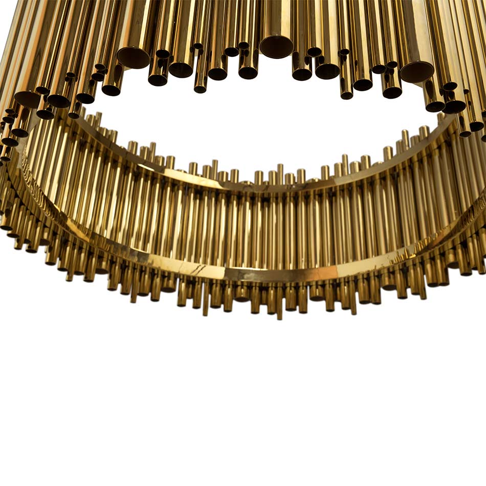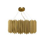Brubeck mid-century modern chandelier is inspired by one of the foremost exponents of cool jazz: Dave Brubeck. This unique lighting design represents the sophistication and finesse of the American jazz pianist, displaying a very luxurious feeling. DelightFULL’s skilled artisans handmade this round chandelier in brass, covering it with a gold-plated finish, which can be customized in multiple other finishes. The result of this outstanding creation is a functional dining room chandelier with sculptural shapes.