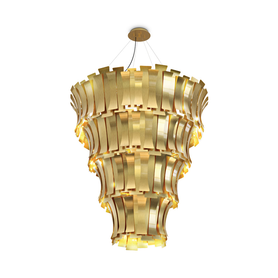 Etta is a large chandelier inspired by one of the best jazz singers of all times. Being the sophisticated lighting design it is, it boasts a nostalgic and feminine vibe, making it the right choice for every luxurious interior design. Each one of its brass leaves are shaped and assembled by hand by some of the most skilled artisans in Portugal. With a brushed gold standard finish, this bespoke round chandelier can be customized to fit your interior design project. A true example of high-quality craftsmanship, this modern chandelier features four suspended arcs, that together produce a feeling of bliss in every refined living room or grand hall.