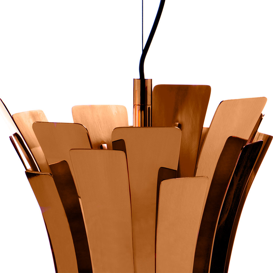 Etta pendant lamp boasts a nostalgic and feminine retro glow, courtesy of the jazz singer Etta jones, which was the inspiration for this curvy lighting fixture. Etta is a luxurious pendant light with 20 different brass leaves, which are all shaped and assembled by hand by DelightFULL’s skilled artisans. Etta’s standard copper plated finish helps to provide a soft and warm light, that is cast through its layers, giving a romantic ambiance to any setting. Nevertheless, keep in mind that this mid-century suspended light can be customized according to your needs and requests. It is the ideal copper pendant lamp for a sophisticated kitchen design, but it can also be used as a suspended bedside lamp.