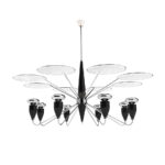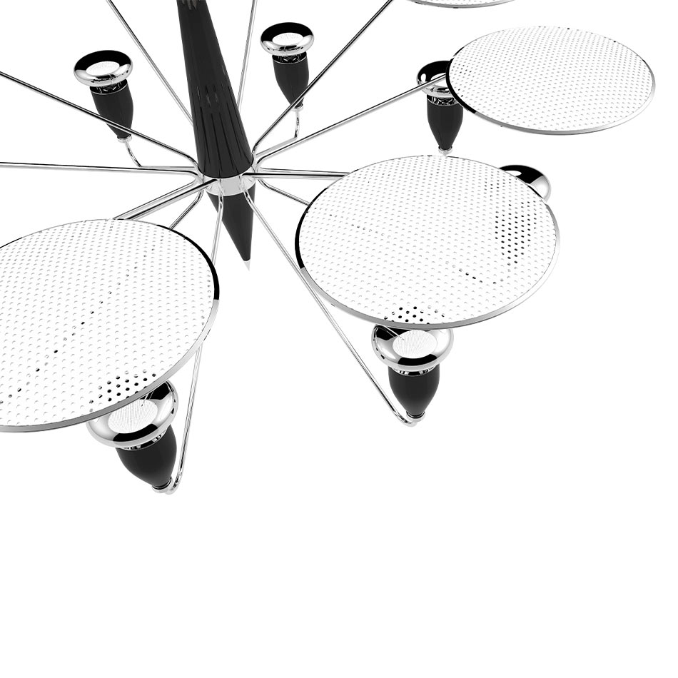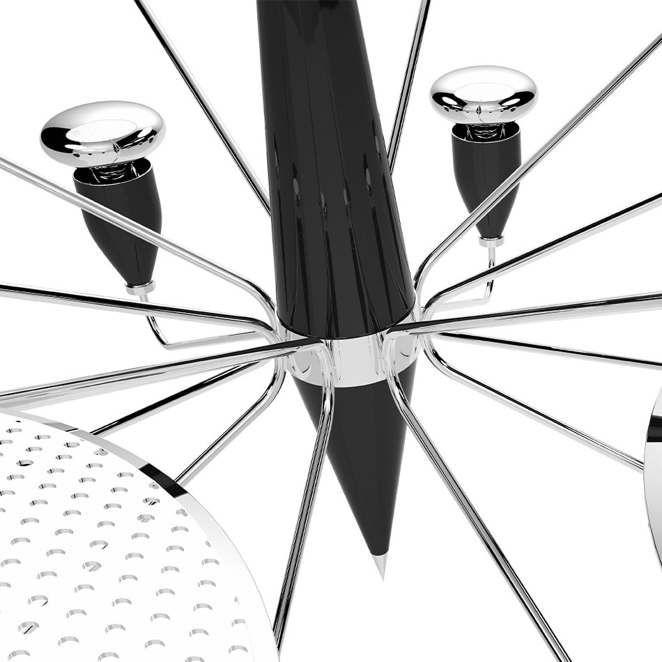 Peggy modern chandelier has a 60’s feel that won’t go unnoticed. With a structure handmade in brass and with a top cover in perforated steel, this unique lamp has a nickel plated and matte white finish. The dazzling lighting design lamp shades are in matte black, making an incredible contrast with the matte white top cover, that characterizes this contemporary chandelier. With almost 18 pounds, Peggy chandelier light also offers the choice of having only 4 of the 8 diffusers lit on. Peggy is a great modern lighting solution for your living room decor and can also be used as a modern dining room chandelier.