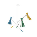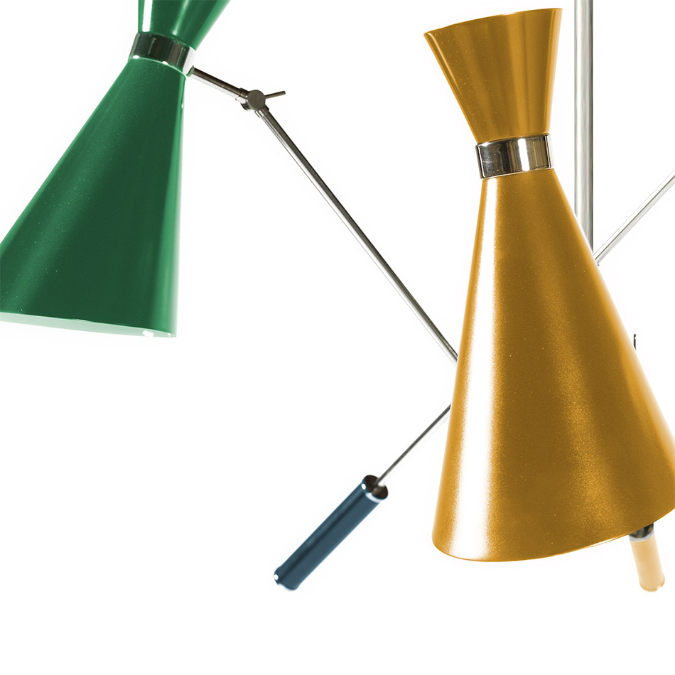 Stanley retro pendant lamp is inspired by some of the most iconic lighting designs of the 1960s. It is handmade in brass and aluminum, with a nickel plated finish on the body, and glossy black lacquer on the outer part of lampshades. The inside is lacquered a matte white. With three changeable arms, this mid-century modern lighting fixture has three counterweights all built of iron. All these features can be customized by request to include different finishes and any RAL color of your choosing. A modern light pendant that embodies all the best from the from the 50s and 60s interior design style, which looks amazing in any mid-century dining room, or a colorful kitchen.