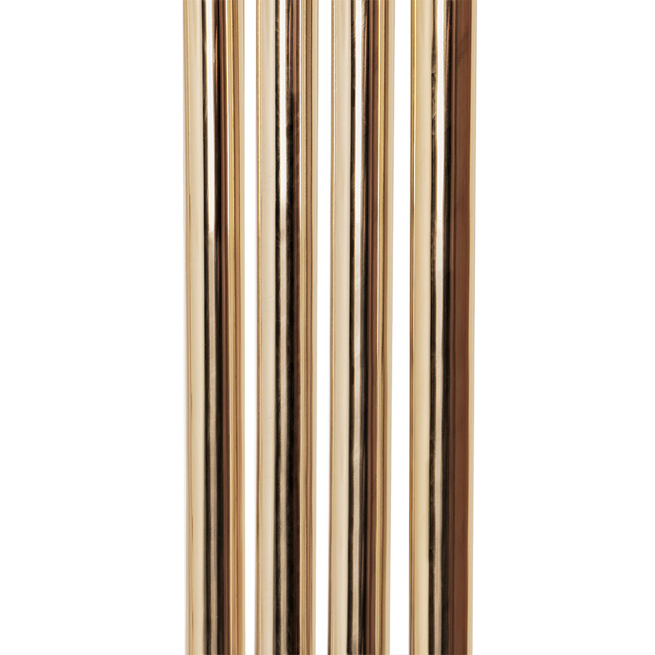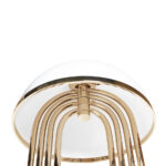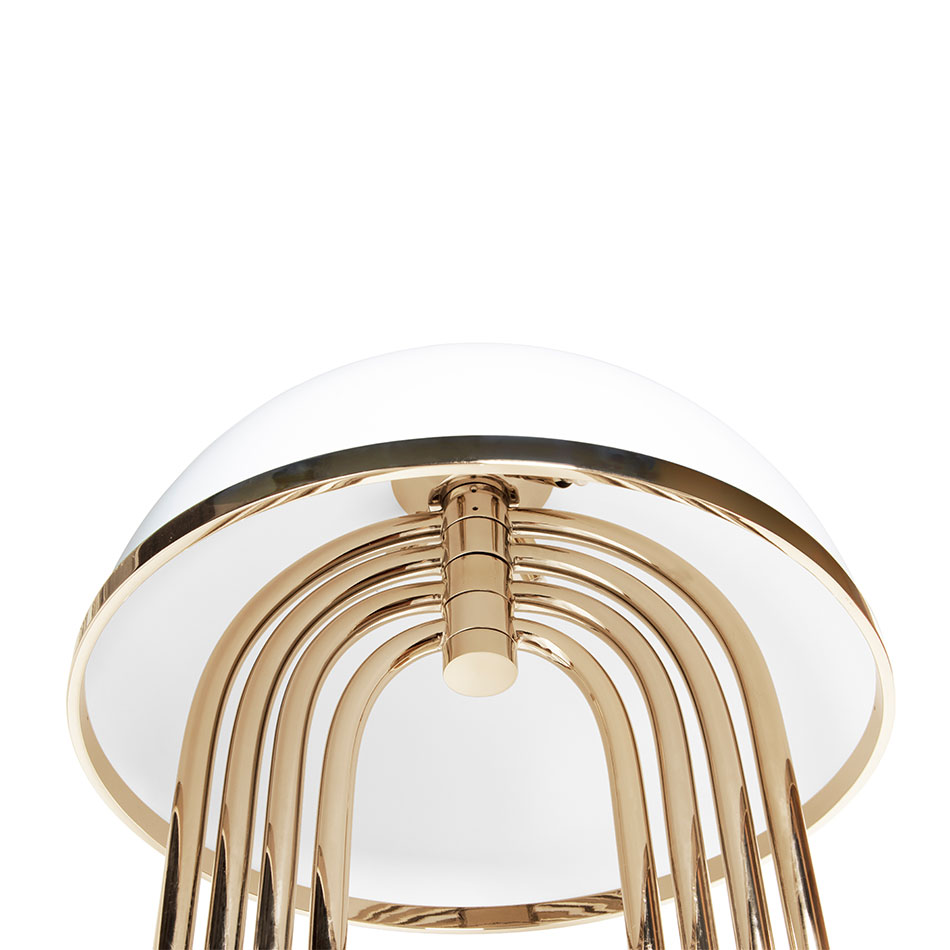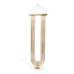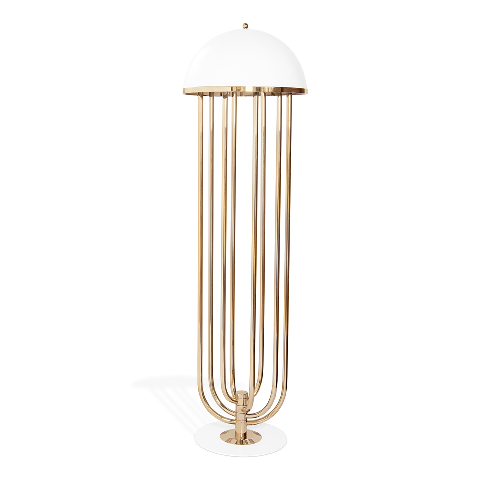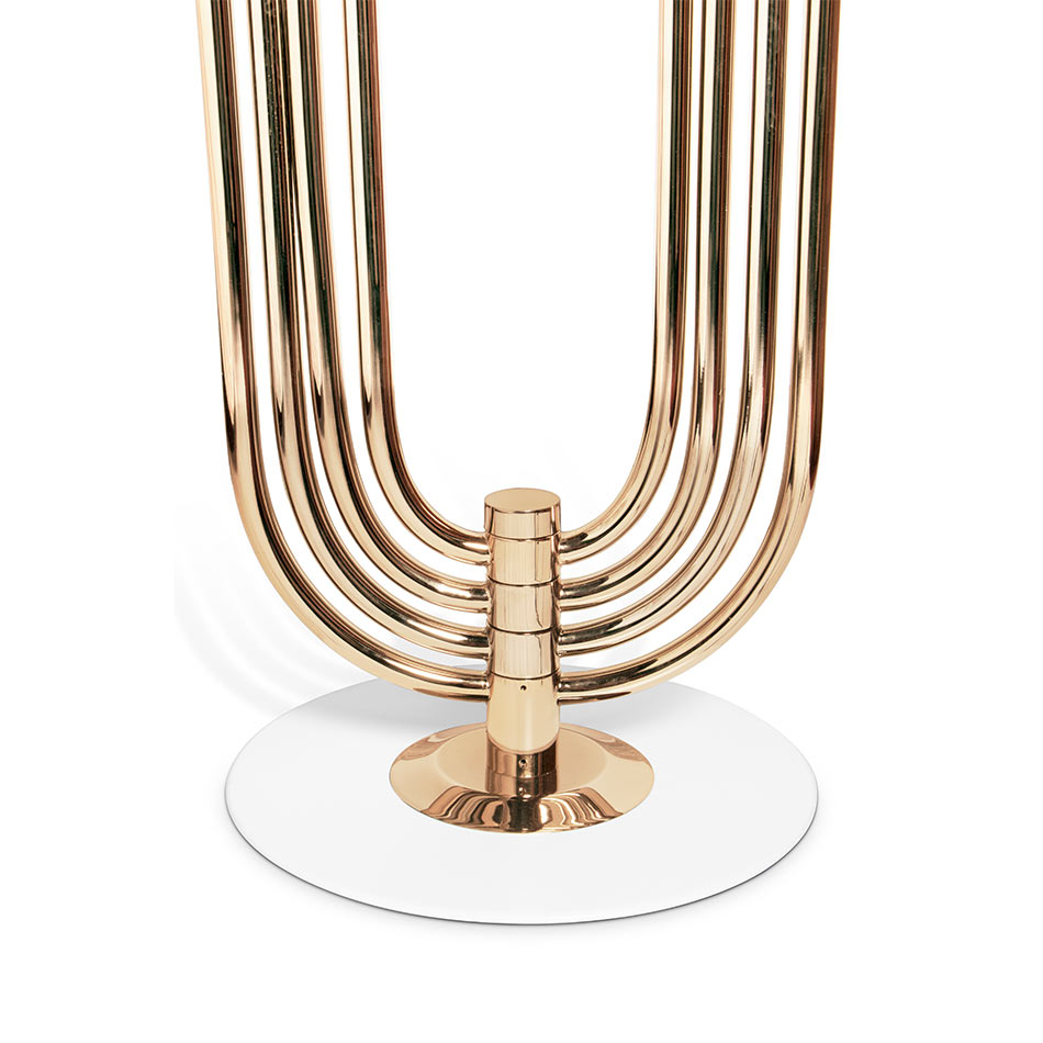 Turner floor lamp was inspired by Tina Turner’s electrifying dance moves. Ideal for any hotel design project, this art deco floor lamp will fit perfectly in a modern lobby entrance or next to a mid-century lounge chair. This mid-century floor lamp has five large arcs made of brass and a semi-spherical top cover of aluminum lacquered in glossy white or any other RAL color of your choosing. With the possibility of rotating its arcs into the desired position, Turner floor light is perfect for anyone looking for a practical lighting design with a cutting-edge design. All in all, this modern corner lamp allows you to create your favorite composition at any time, elevating your mid-century modern decor.