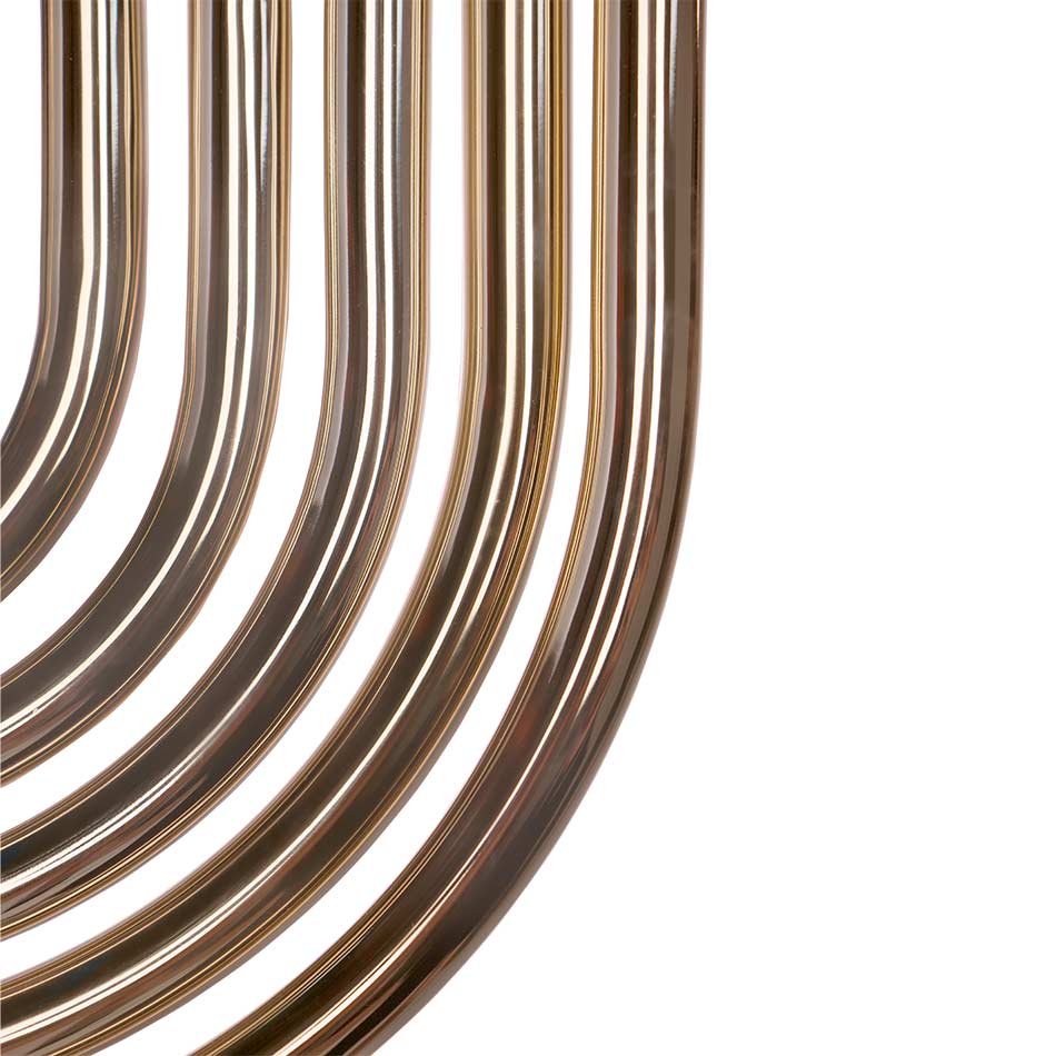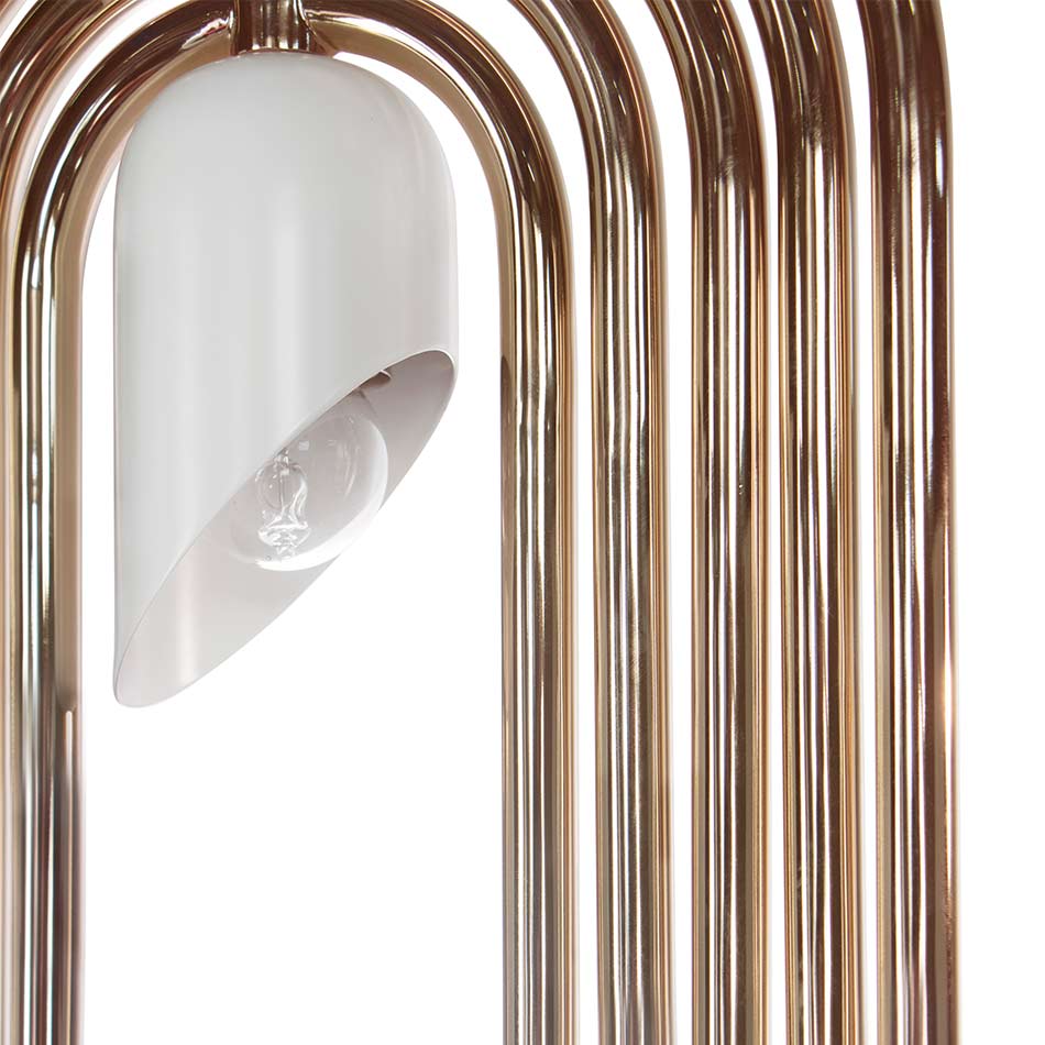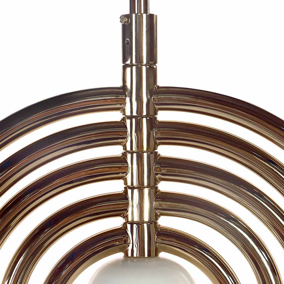Inspired by the astonishing and memorable dance moves of the iconic pop singer, DelightFULL’s design team created the Turner family. Turner pendant lamp is an art deco lighting fixtures handmade in brass and aluminum that boasts all the most special elements of this design movement. The body has five gold plated finished movable arcs, which can all be rotated into the desired position, giving this modern pendant lamp a sense of fun. The small shade on the center is lacquered a matte white, but it is customizable with any RAL color of your choosing. Turner suspension light is a versatile piece, that can be used in almost any room of your house. However, it looks its best when used as an alternative bedside lamp, or when placed in an art deco inspired living room.