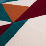 A contemporary low pile rug featuring a mesmerizing pattern of colored triangles. It uses a synthetic fiber called tencel and is produced using a cut-and-loop technique. The brightly vivid colors mix with the abstract geometric pattern.
