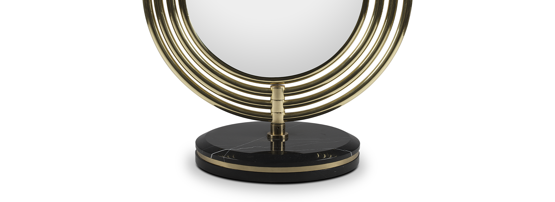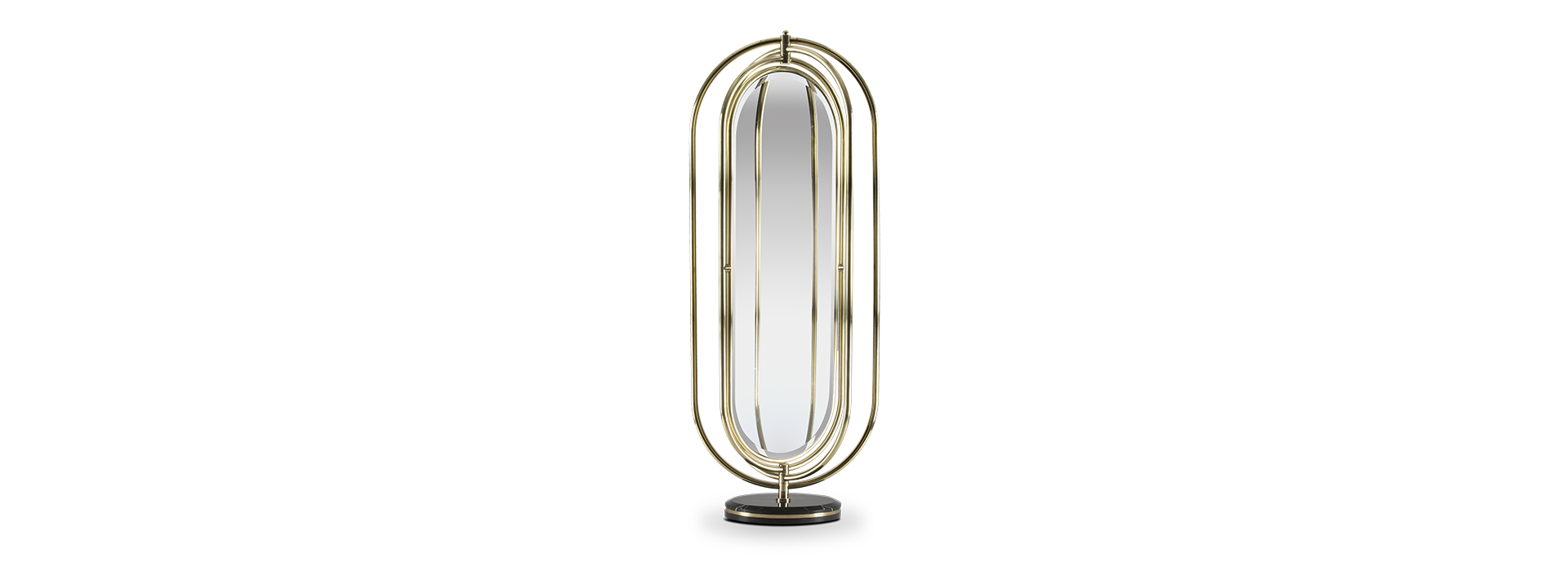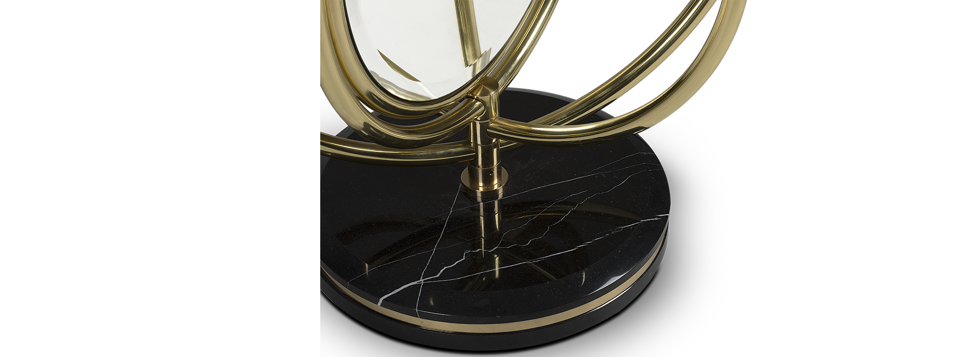 Colosseum is a dazzling full length floor mirror supported by a Nero Marquina marble base, accented by a brass trim around it. The frame structure is built in polished brass tubes, assembled to produce an oblong shape. The rings rotate 360 degrees, making this mirror a flexible and perfect piece to decorate your luxury bathroom or your luxurious closet.