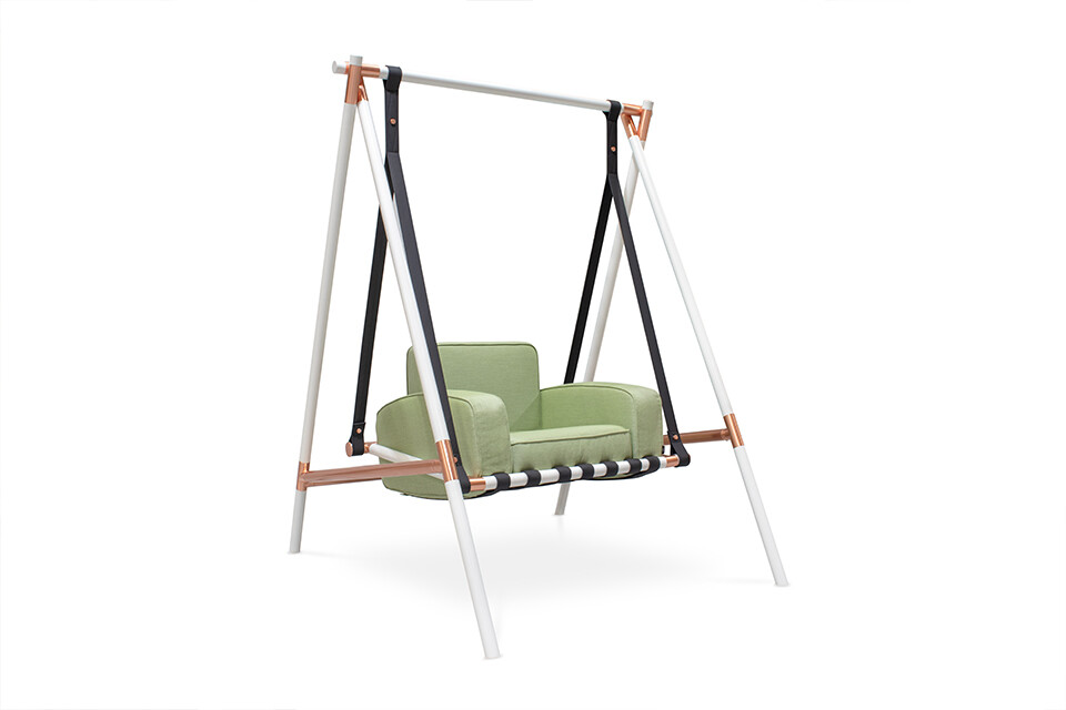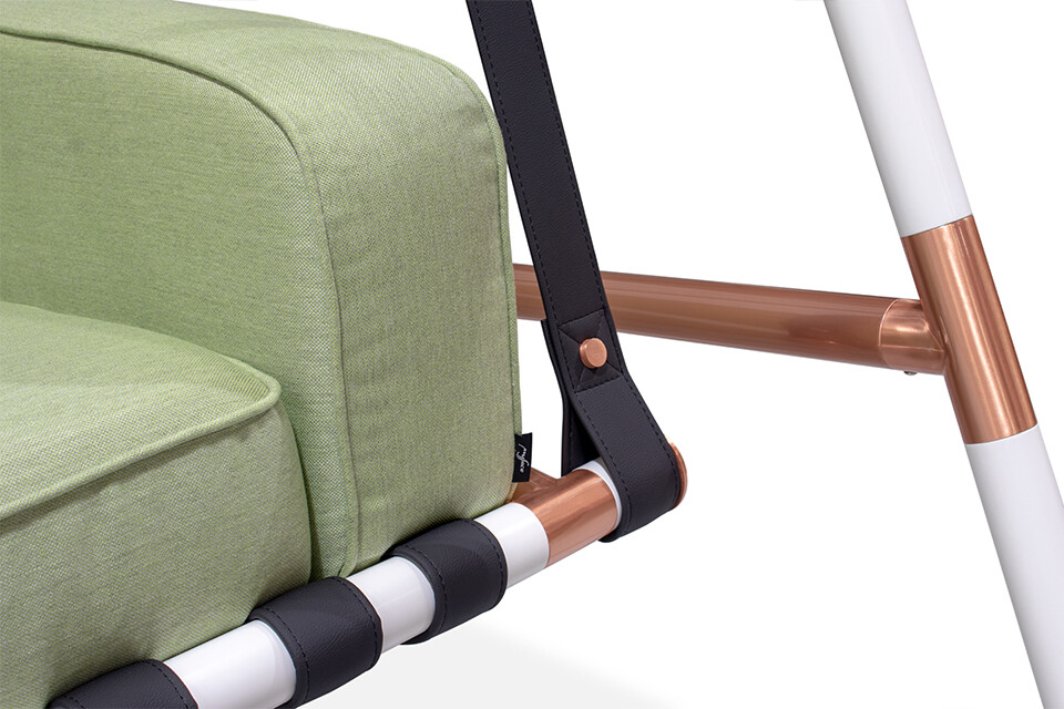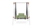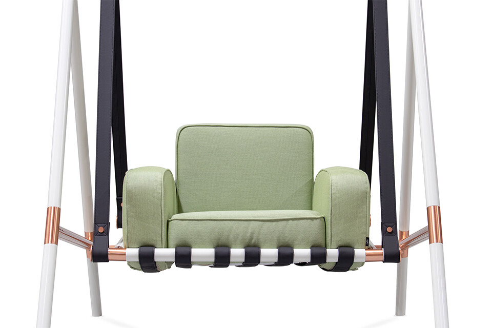 Lacquered stainless steel and plated details are the main support for the Fable swing armchair, which’s available in a wide color array of customizations. The bottom seat cushion is a breathable mesh that enhances its long life.