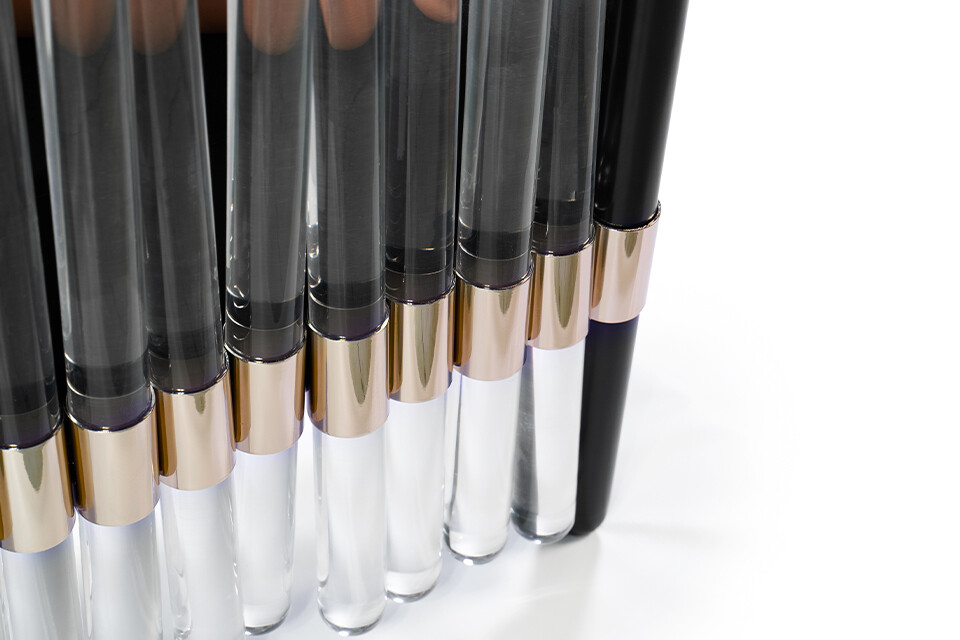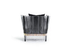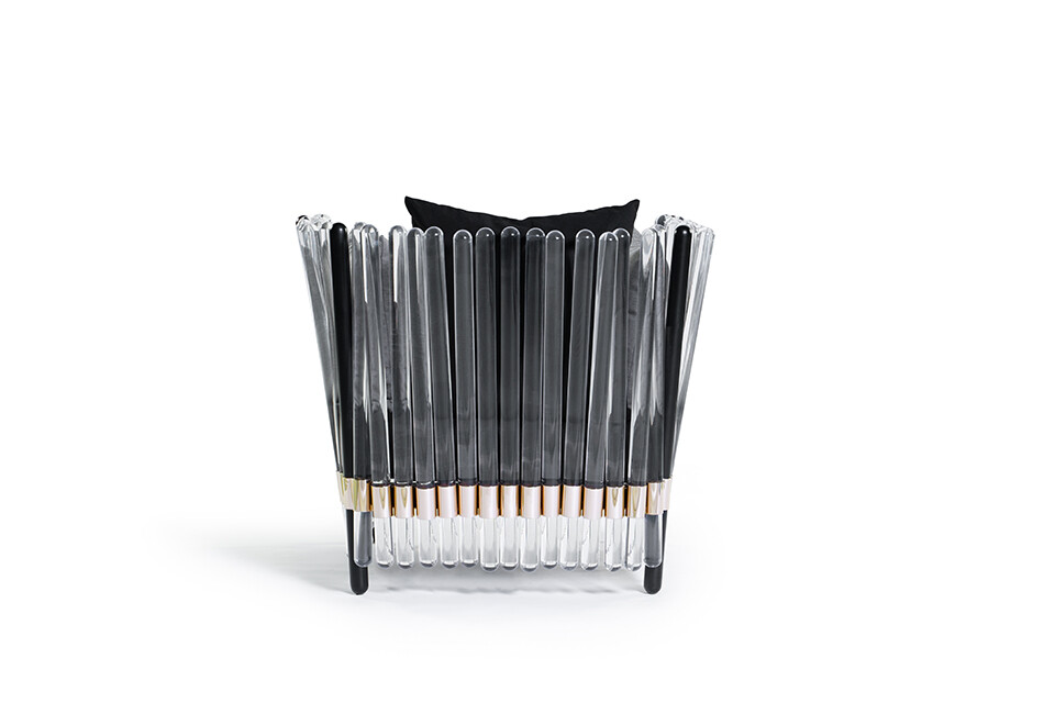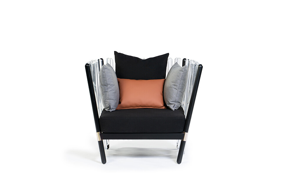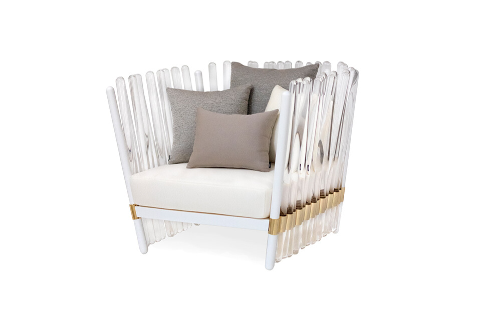 Due to its elegant gold-plated stainless-steel details, and its rods in clear acrylic, the Houdini Armchair allows all the existing lights and shadows to shine through the piece. The bottom seat cushion is a breathable mesh that enhances its long-life. Pillows included.