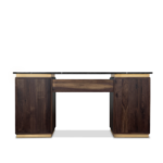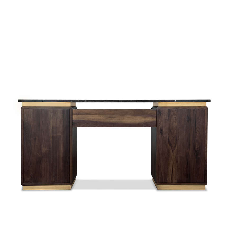 A writing desk with a soulful and sleek visual — Clean and Monolithic. It features two cubic towers crafted from varnished walnut veneer with two doors made out of Nero Marquina Marble made to impress. Brass details were added to the base and below the marble countertop, producing a soulful and sleek visual to the desk.