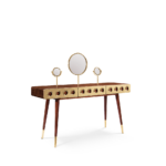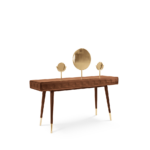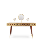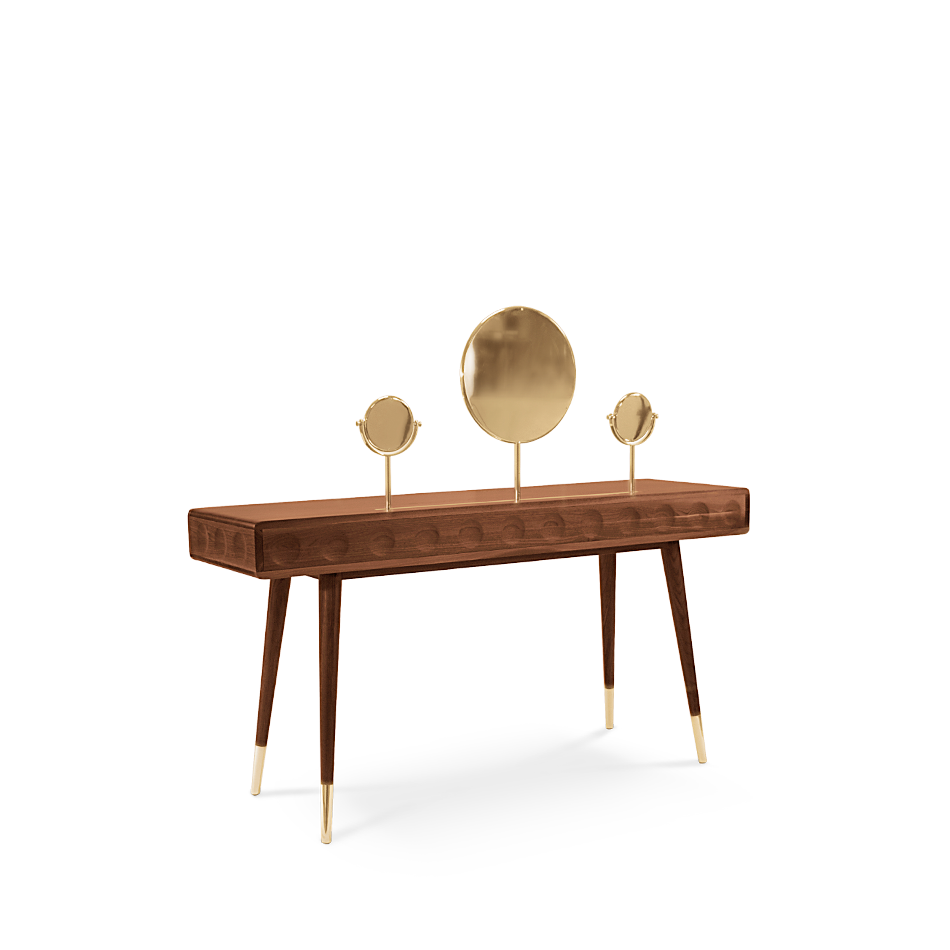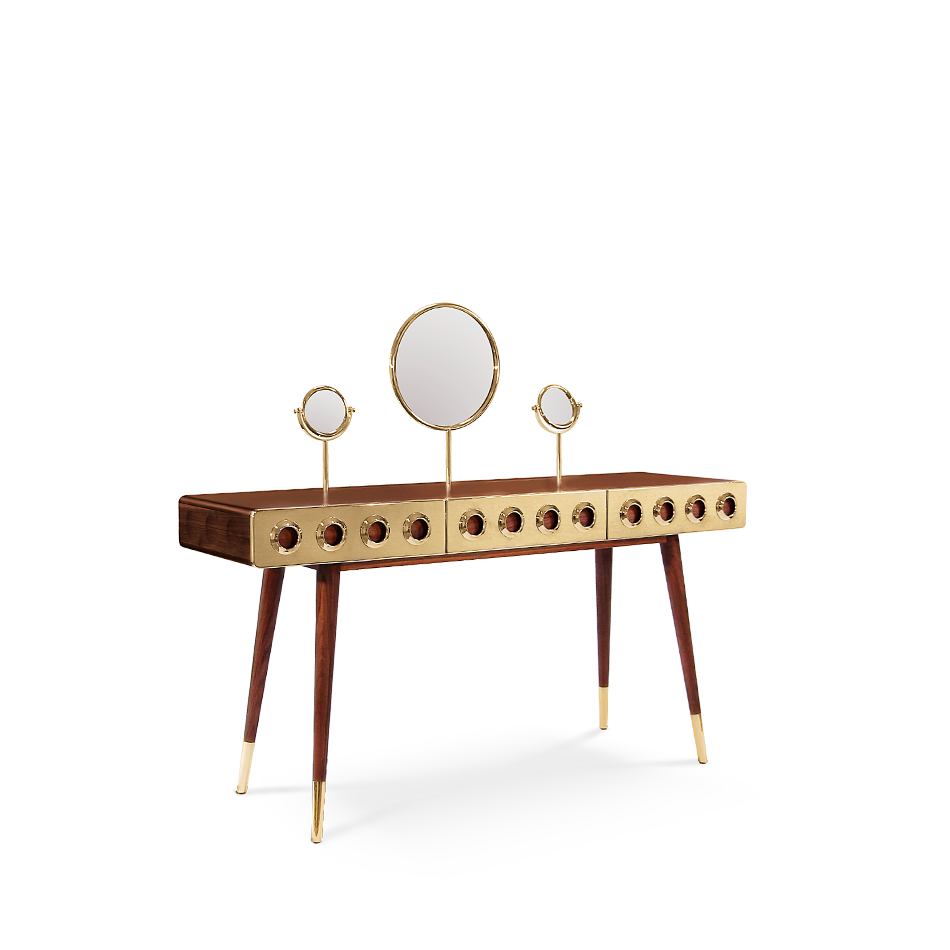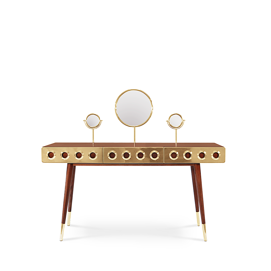 A stunning addition to your glamorous boudoir. Constructed with solid wood, it boasts three front drawers in metal. Supported by atomic legs, the retro table showcases three bullseye mirrors with metallic rims and rotating smaller ones.