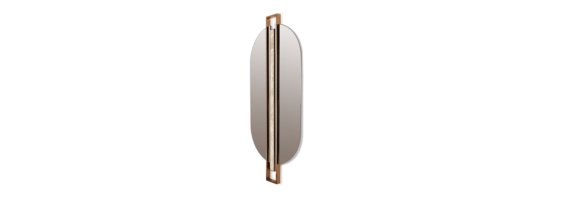 Shield is a oval mirror made entirely from mirror, bronze brass and a Light Emperador marble bar. Inspired in the most ancient and valuable armor, the Shield of Achilles, we re-designed the Shield Mirror, meaning of protection and security. Decorative yet practical, you will have a divine mirror just for you.
