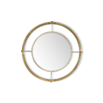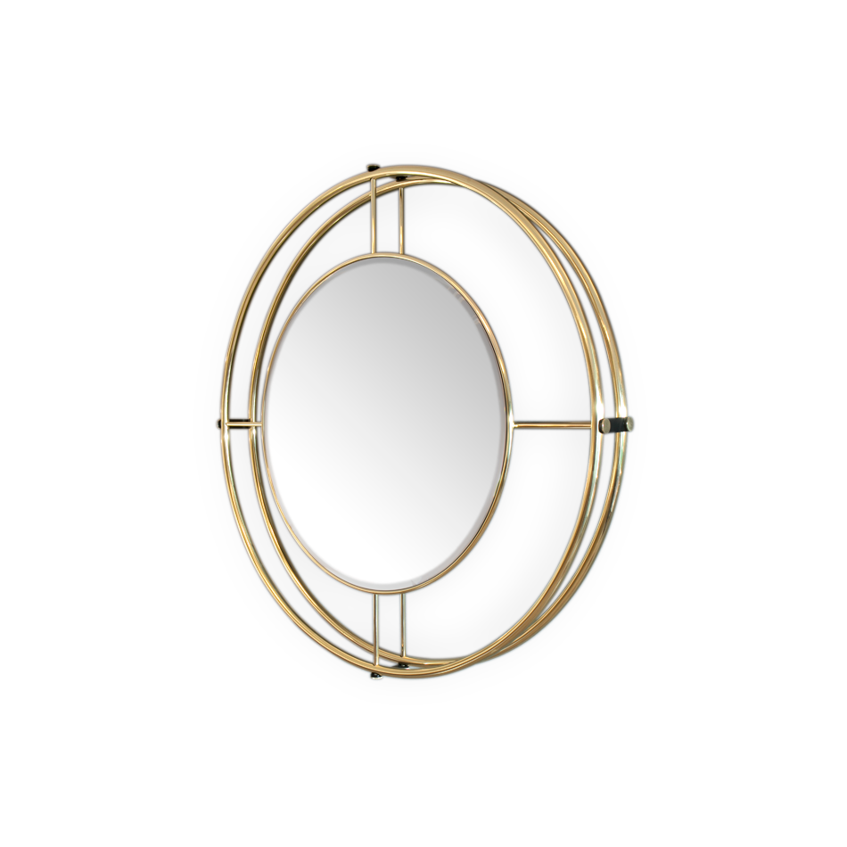 A beautiful piece of circular geometry. This large circular mirror is a structure made out of curved metallic tubes, that sustain a large circular mirror in the middle, which feels very organic and almost naval-like, creating a stunning and dynamic design. Shirley Mirror can easily be customizable to fit any client’s type of project.