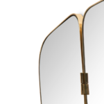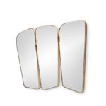 A beautifully designed vanity wall mirror. It features three panels and an irregular shape with a golden strap of plated brass that evokes a mid-century modern style. It can be hung above a sideboard or a console and still give that retro look to your bedroom or living room.