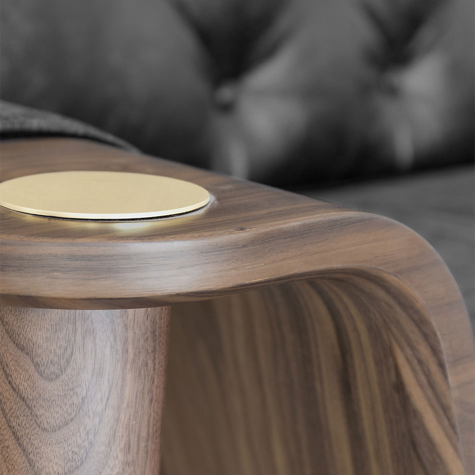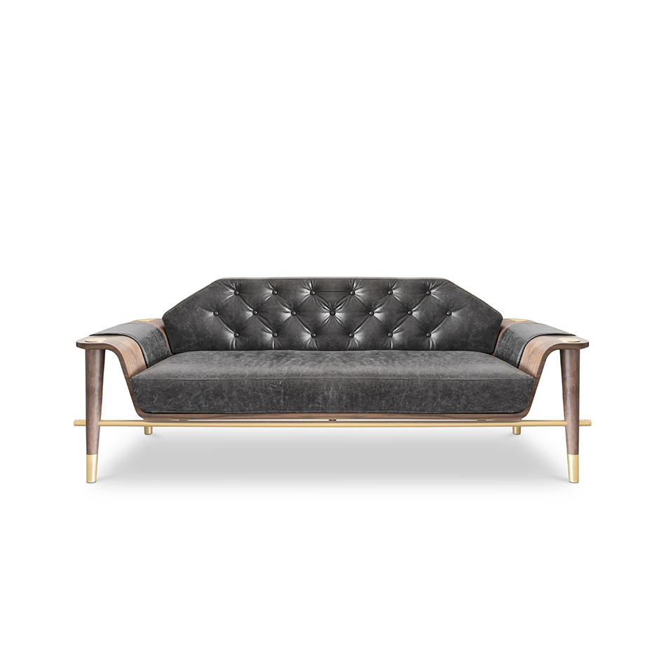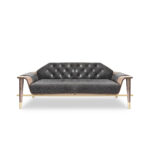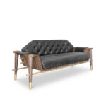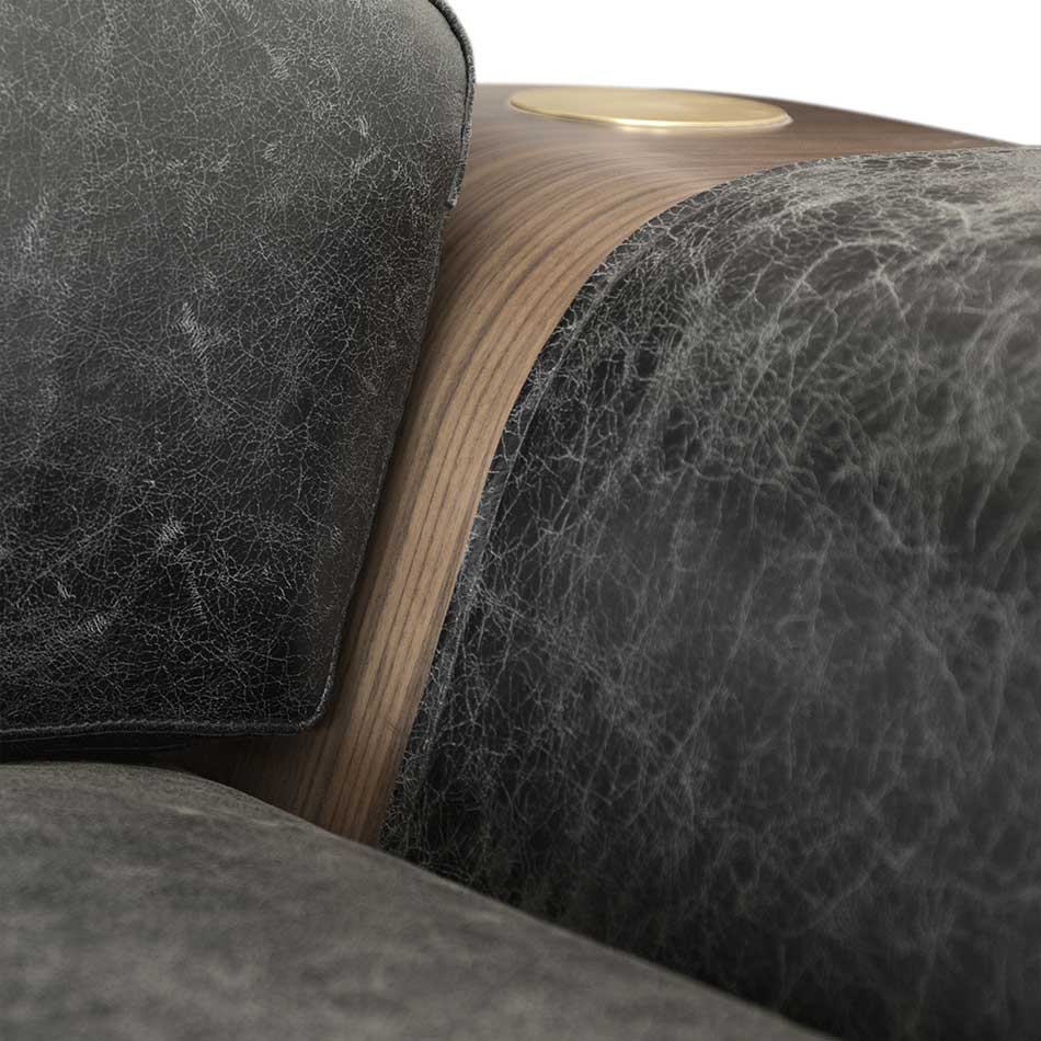 Perfect for a private lounge, Curtis, a modern sofa with a long dark wooden bench, embodies mid-century elegance. Upholstered in soft tufted fabric, it features a single back cushion and side tables. Round tapered legs with metallic details and feet, gives contrast to the dark wooden tones.