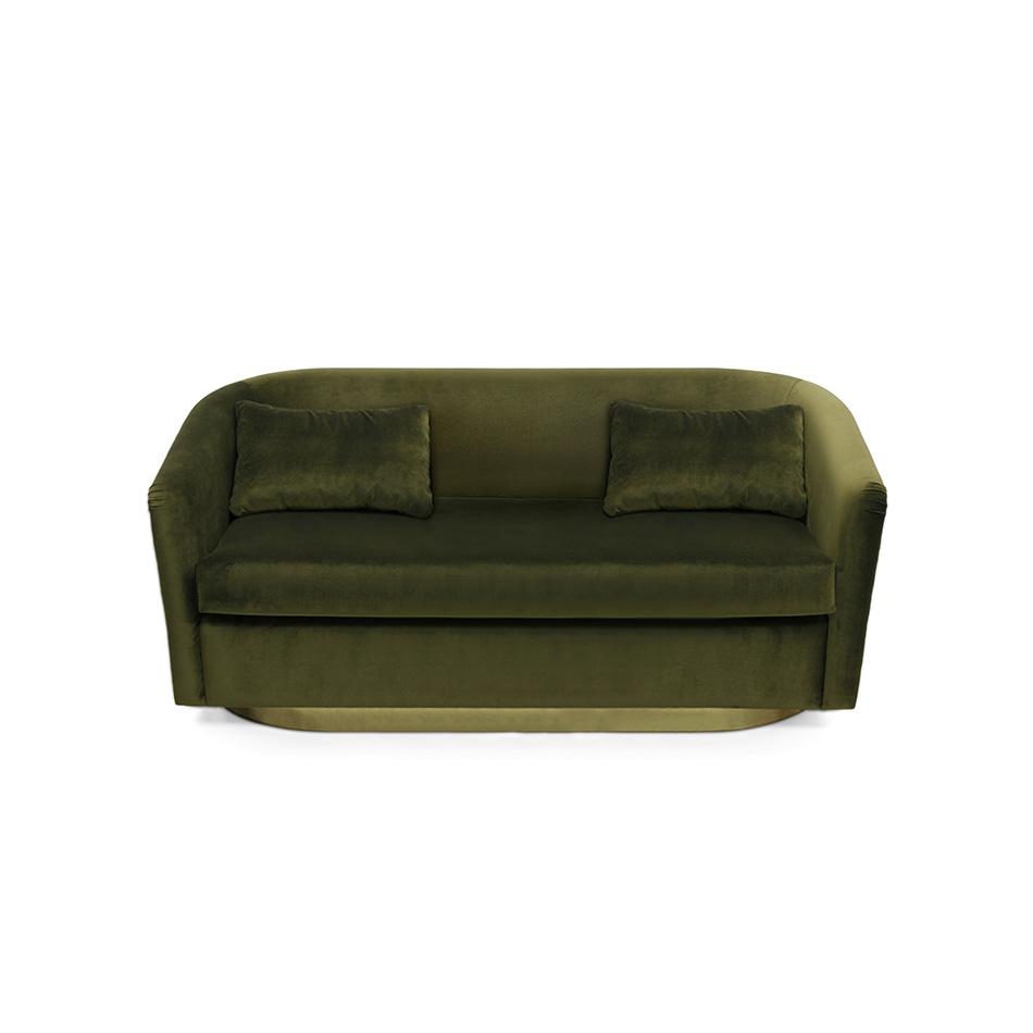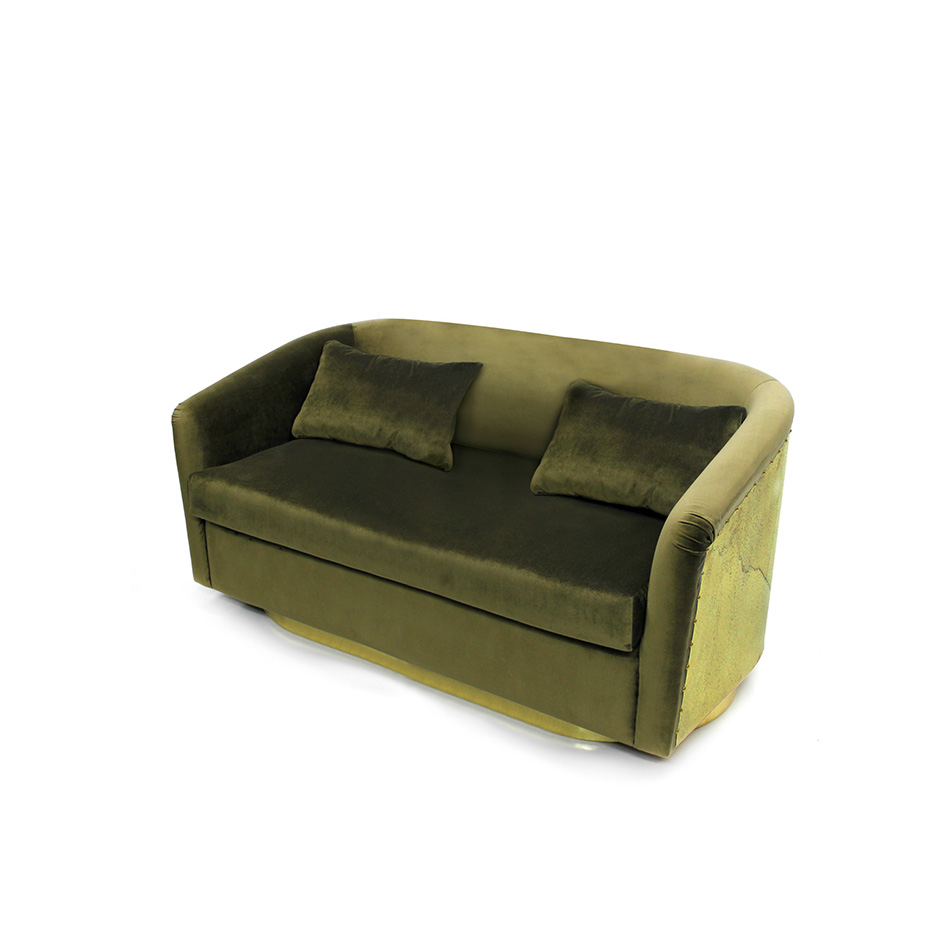 The compelling rotation of the Earth around its axis inspired the creation of EARTH 2 Seat Sofa. Upholstered in cotton velvet, this 2 seat sofa with shelter-style arms has a unique hammered brass back with golden polished nailhead trim. It is this velvet 2 seat sofa that will make a statement in modern interior design.