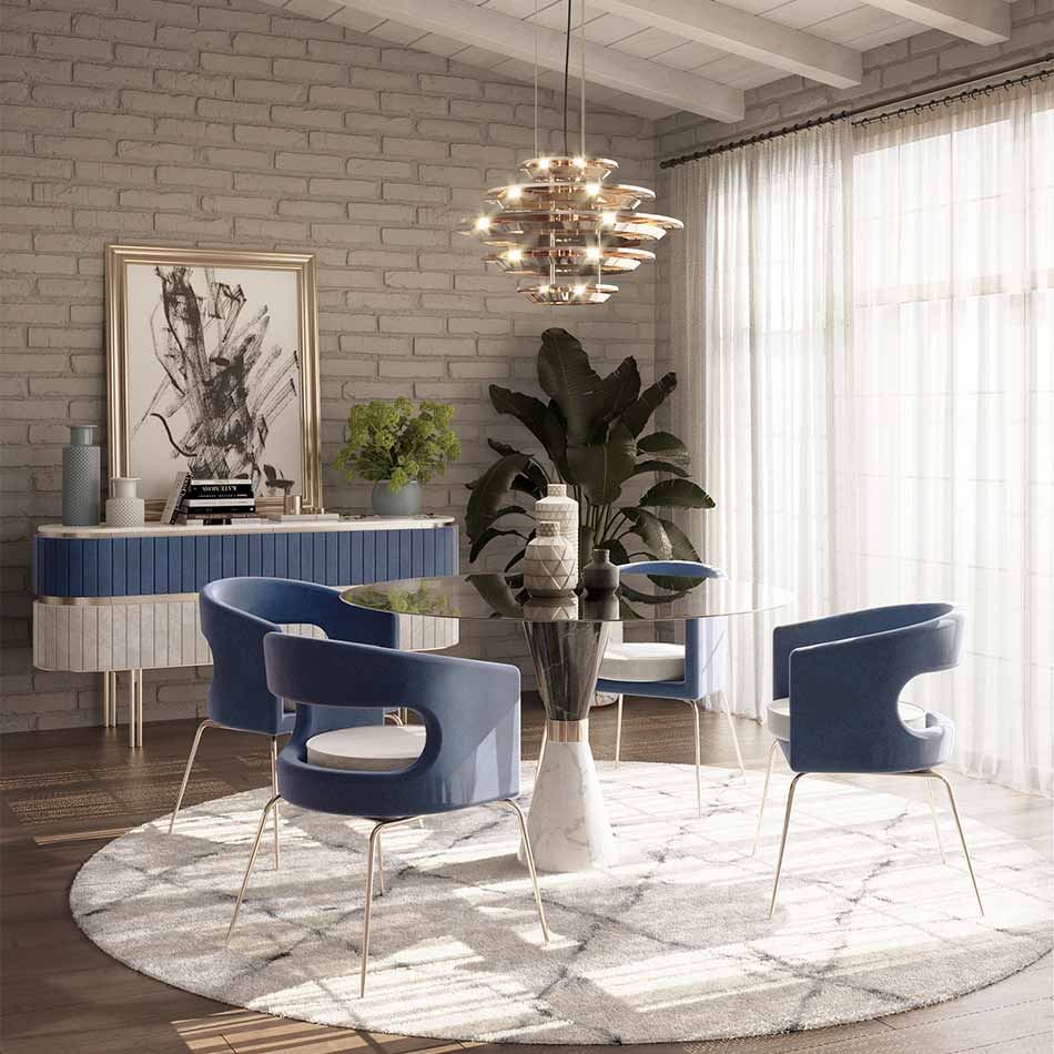 A fanciful dining chair full of luxurious features that will bring personality and uniqueness to your dining room. It is upholstered in velvet and has mixed tones both on the back and the round cushioned pad. Extremely sculptured, and it contrasts with the slim legs made of polished brass.