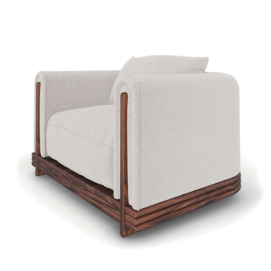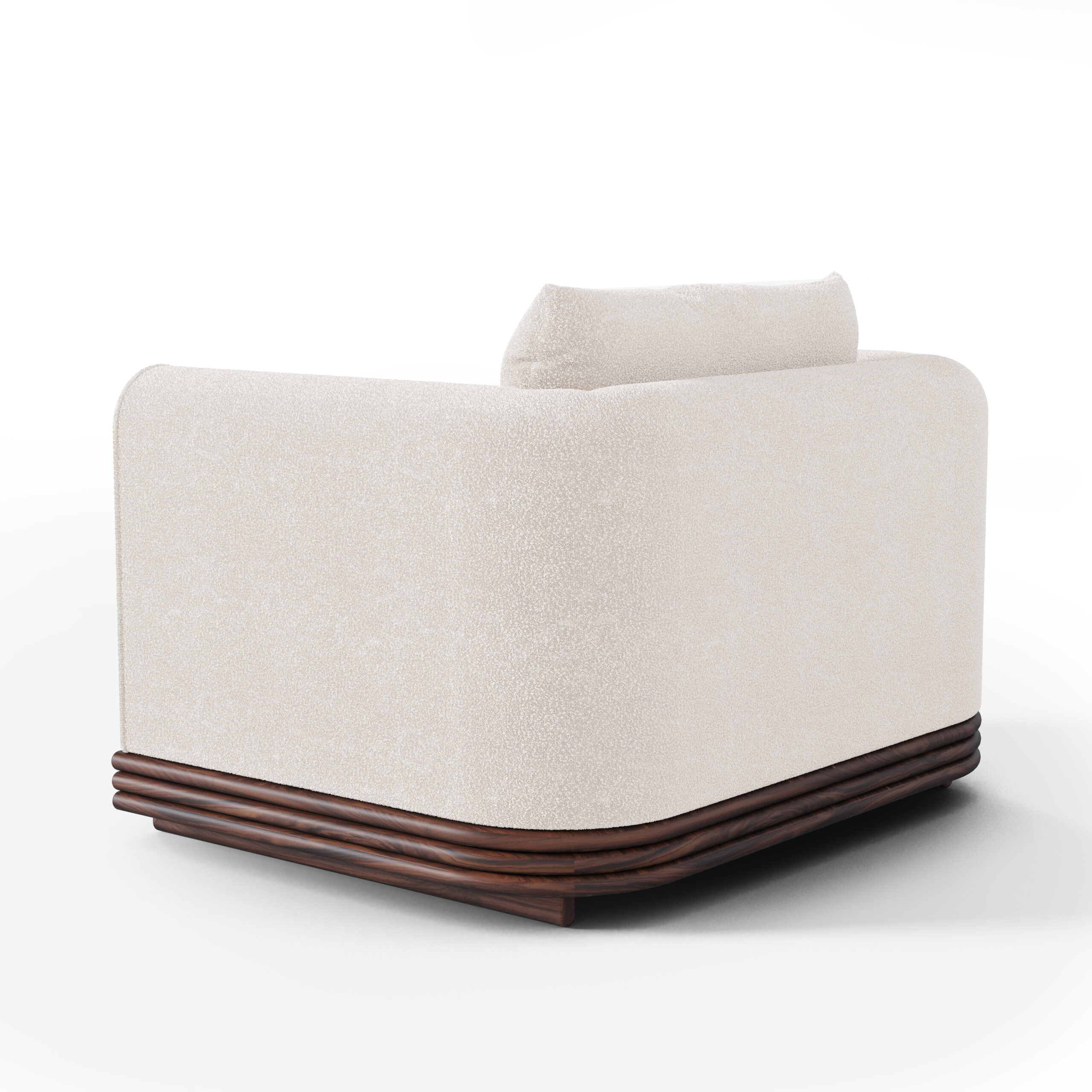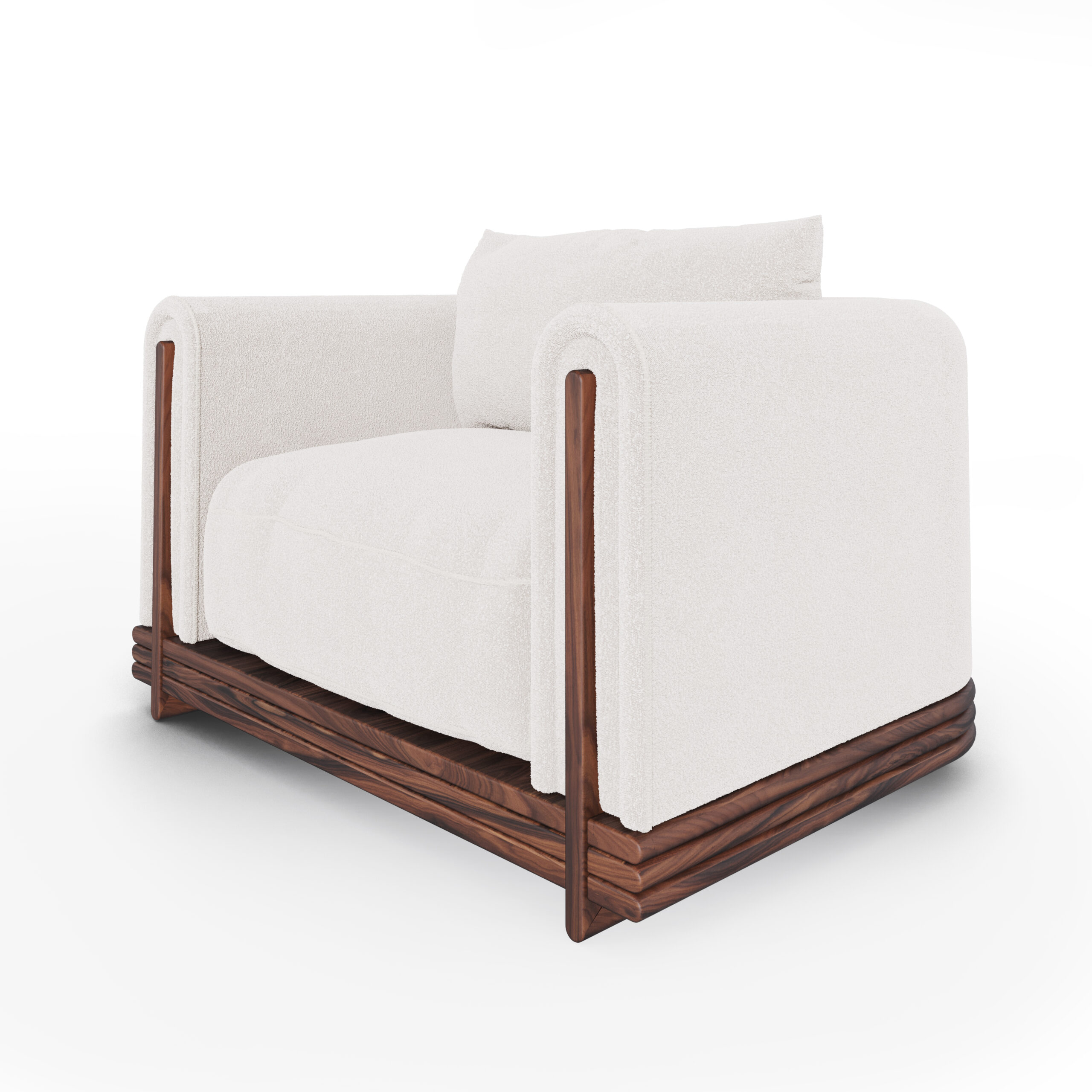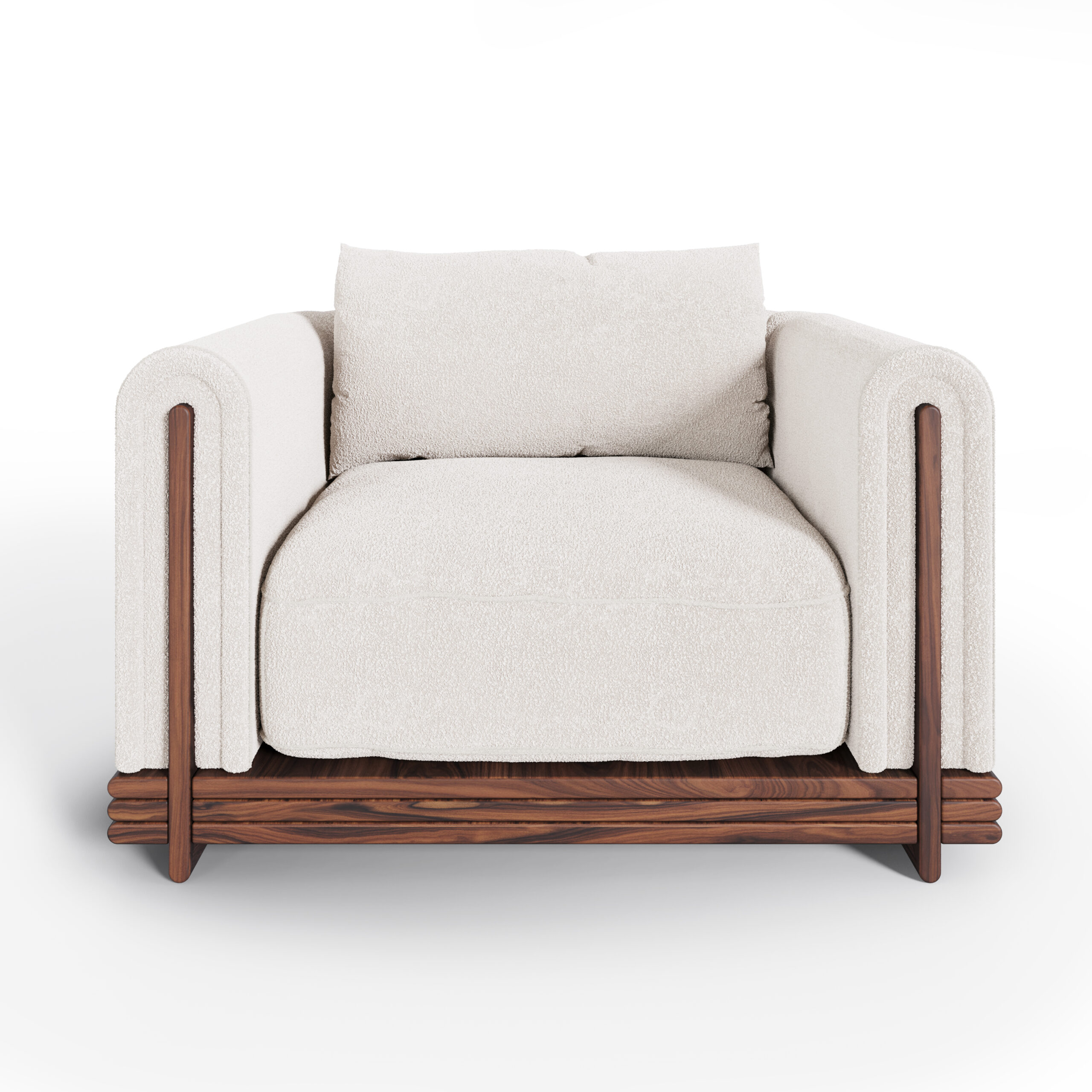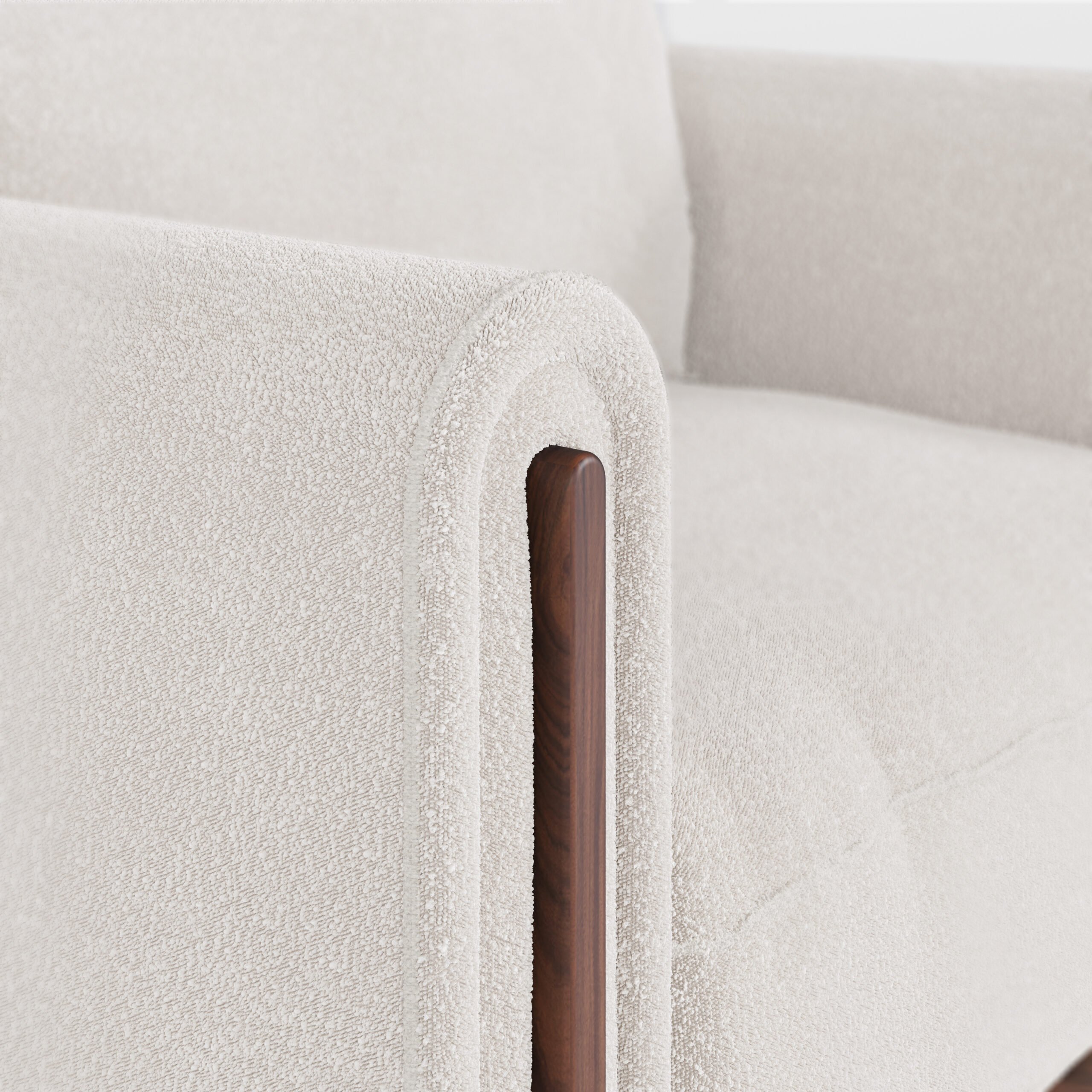 Eva Armchair, where timeless elegance meets unparalleled comfort. Adorned in lavish boucle fabric and accented with rich walnut details, Eva exudes sophistication and refinement, adding a touch of luxury to any living space. Crafted for supreme comfort, Eva boasts three layers on its armchair base, providing optimal support and relaxation.