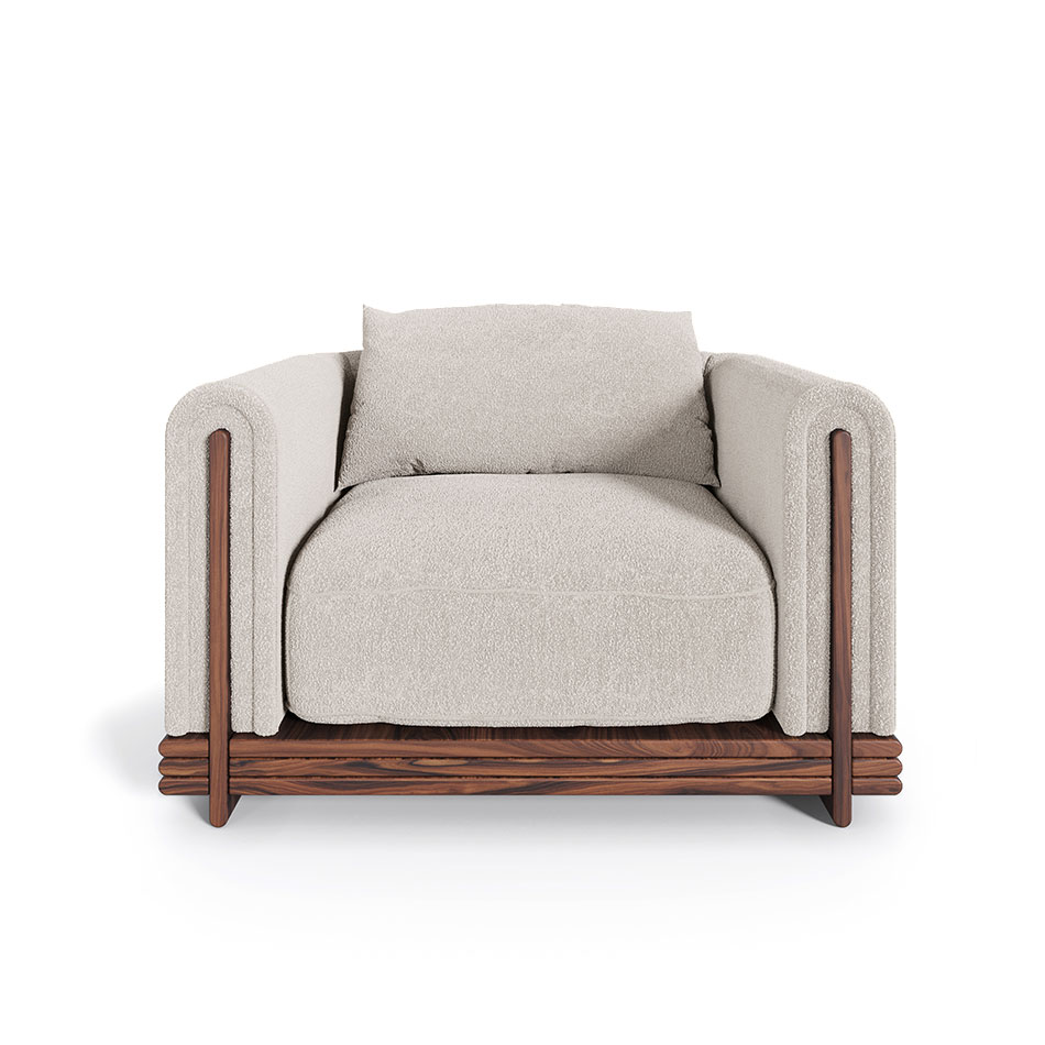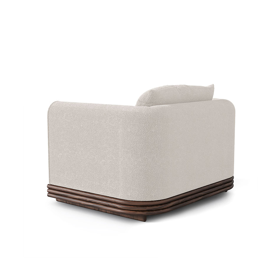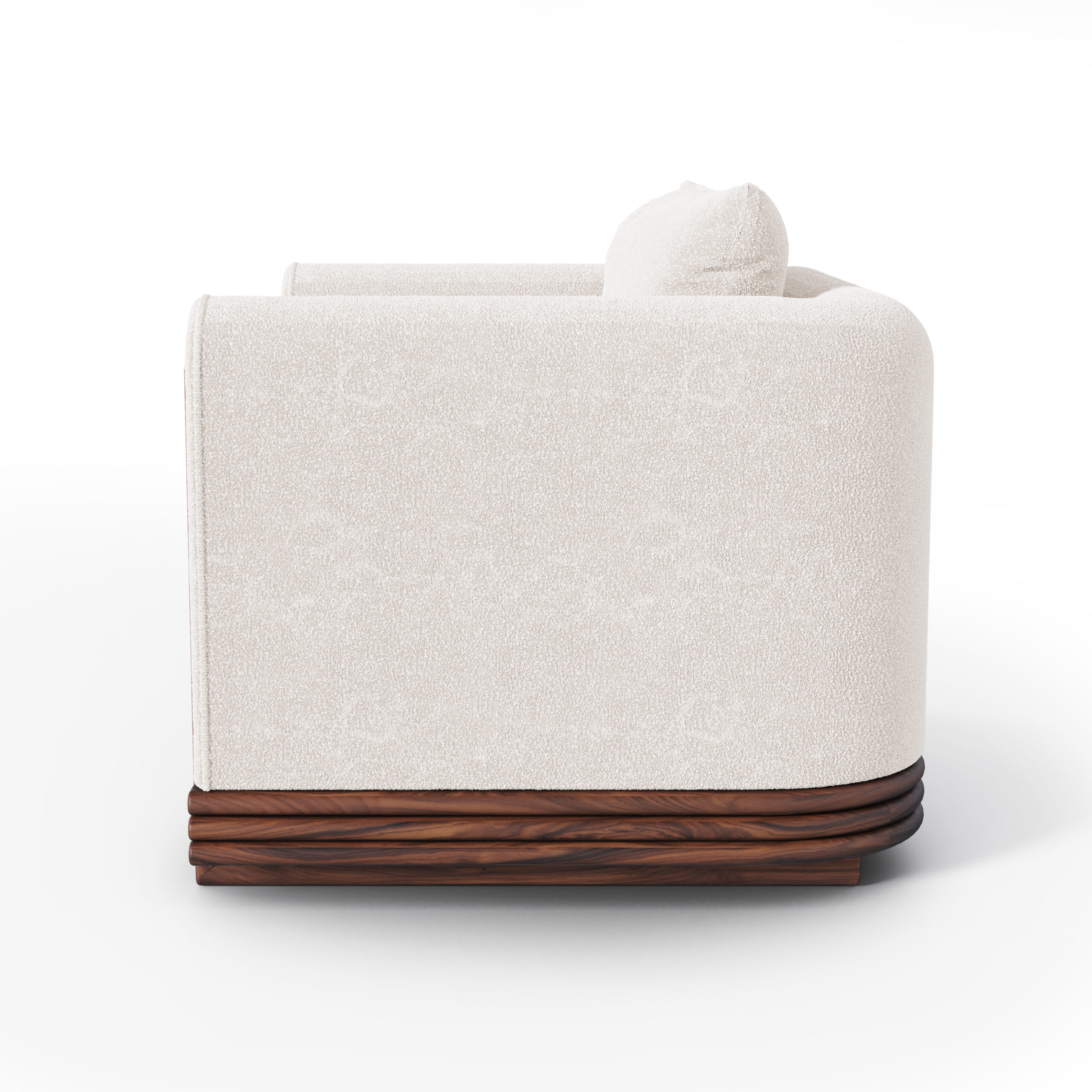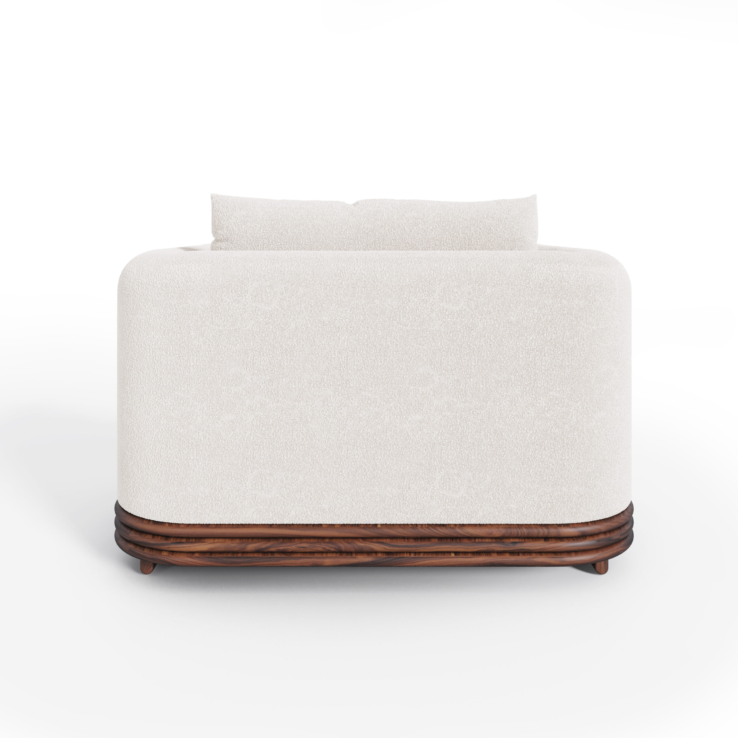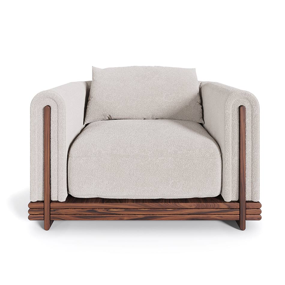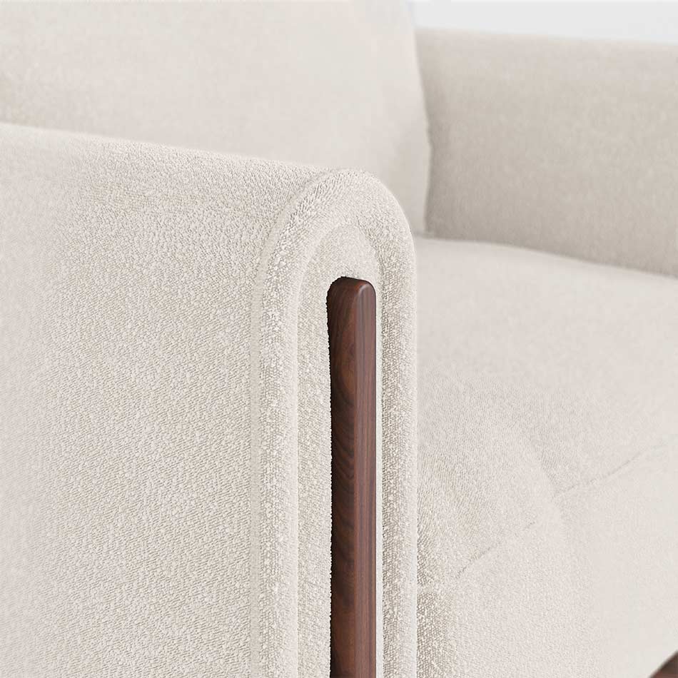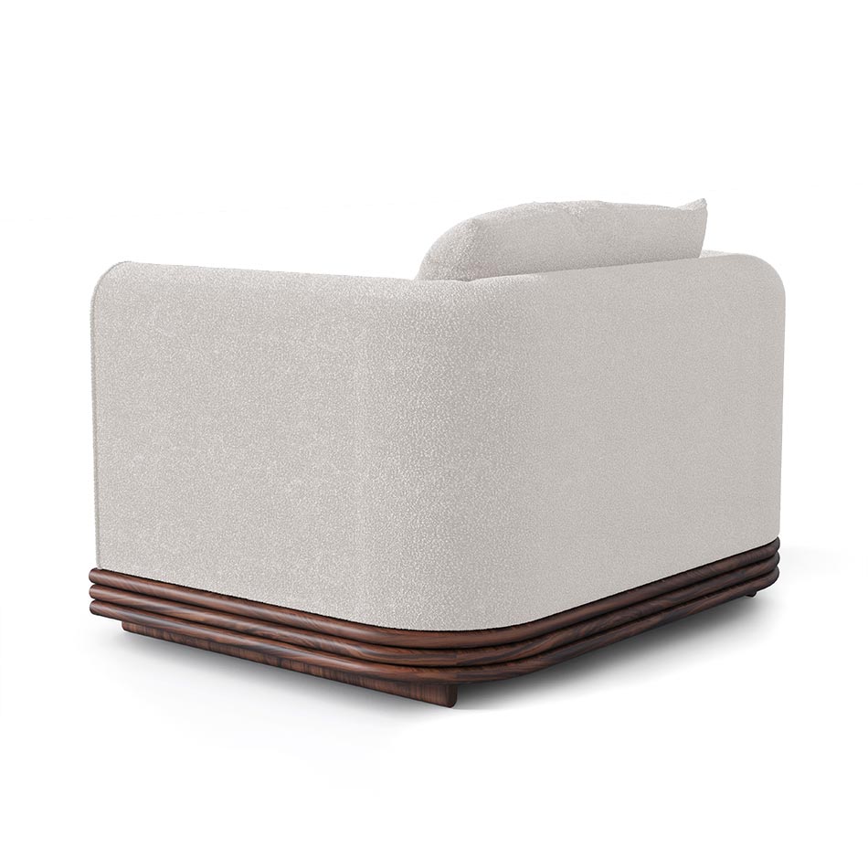Eva Armchair, where timeless elegance meets unparalleled comfort. Adorned in lavish boucle fabric and accented with rich walnut details, Eva exudes sophistication and refinement, adding a touch of luxury to any living space. Crafted for supreme comfort, Eva boasts three layers on its armchair base, providing optimal support and relaxation.