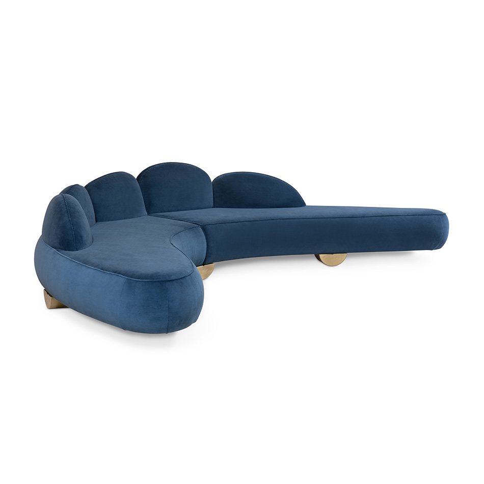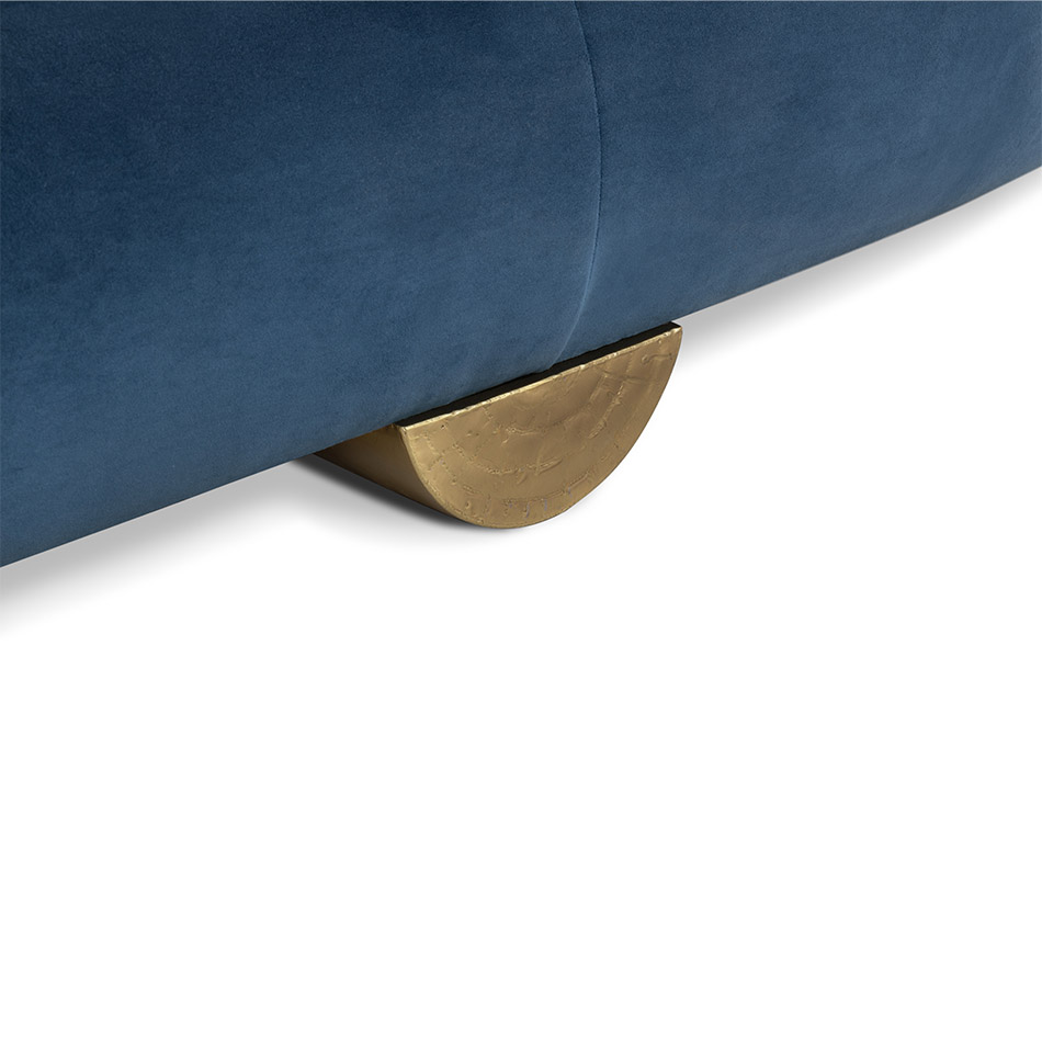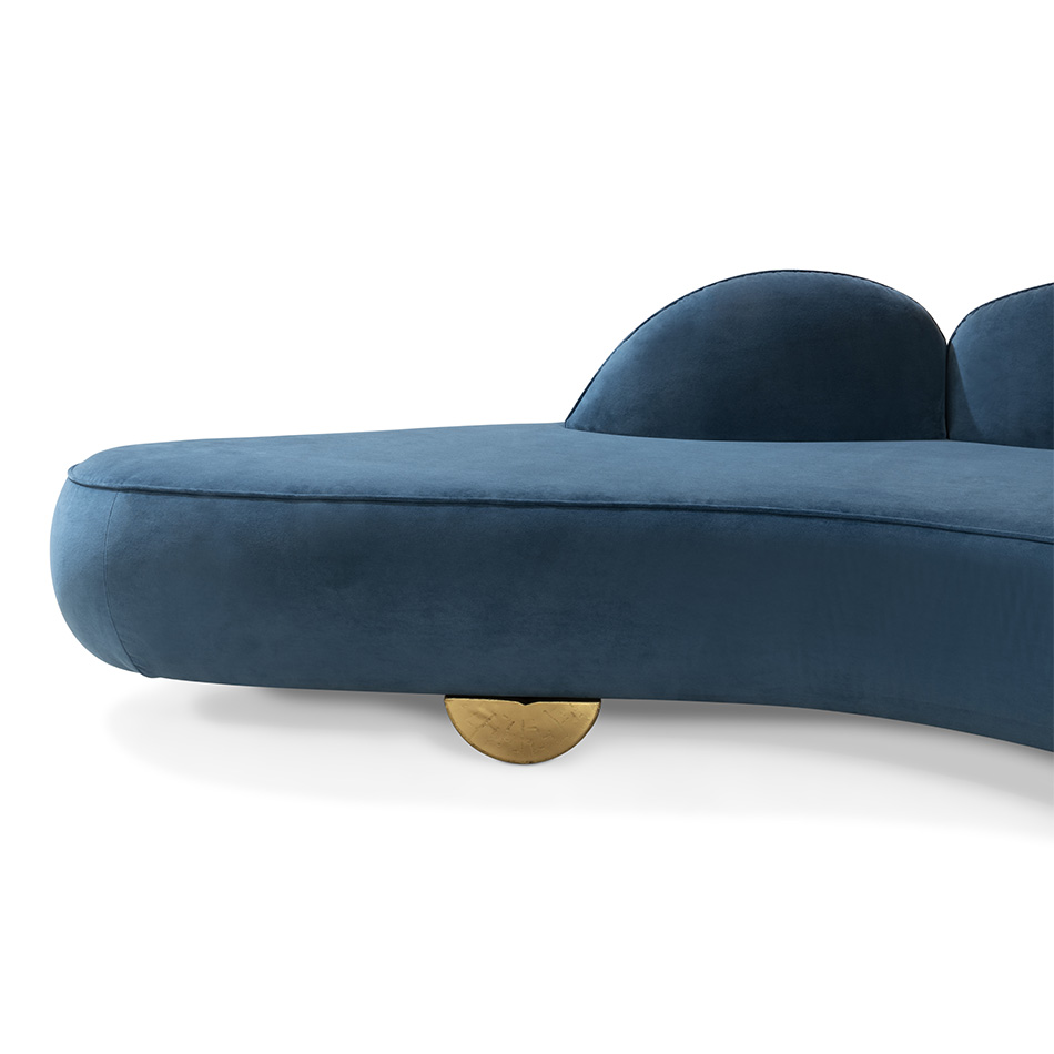 FITZROY Sofa is inspired in Mount Fitz Roy, a mountain in Patagonia, whose name is a tribute to Robert FitzRoy, the captain of the ship that transported Charles Darwin in his travel around the world. This curved sofa, with its back inspired in the outstanding mountain shape, is fully upholstered in cotton velvet and the base is in matte casted brass. FITZROY Modern Corner Sofa will add an organic element to any living room set.