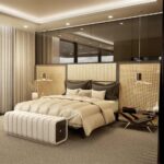 The bed showcases exceptional craftsmanship with its immense headboard, a true display of handskill. Made of solid wood, the hefty headboard features an upholstered center, rattan panels on the sides, and polished metal frames for a touch of luxury. A mid-century spectacle for any room, effortlessly adding natural and luxurious charm to your space.