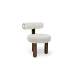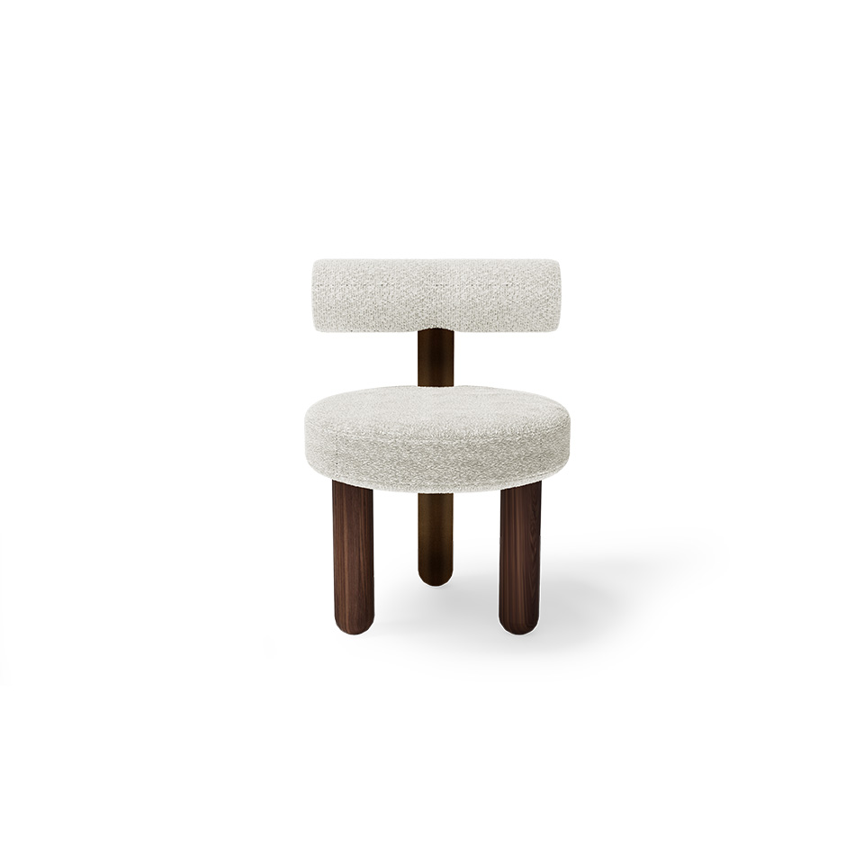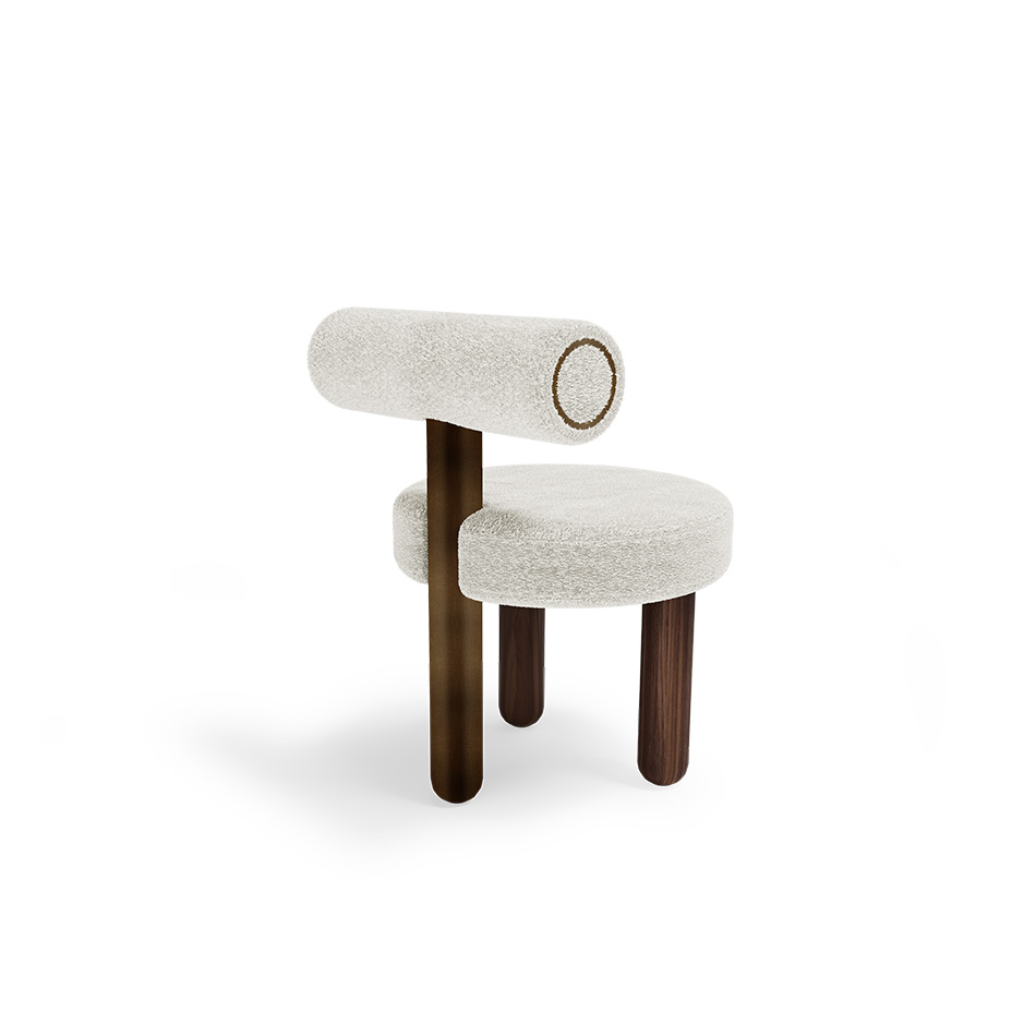 Inspired by the mix of hues and colours created in the iced or cold milk over a steaming hot coffee in the greek Freddo coffee. Like the drink, this chic and minimal dining chair is a sublime and tasteful addition to a dining room, with the softness of the boucle seating and back, a walnut stain matte varnish in its two legs and a long back in stainless steel dark bronze varnish, complete the highly contemporary and minimal design.