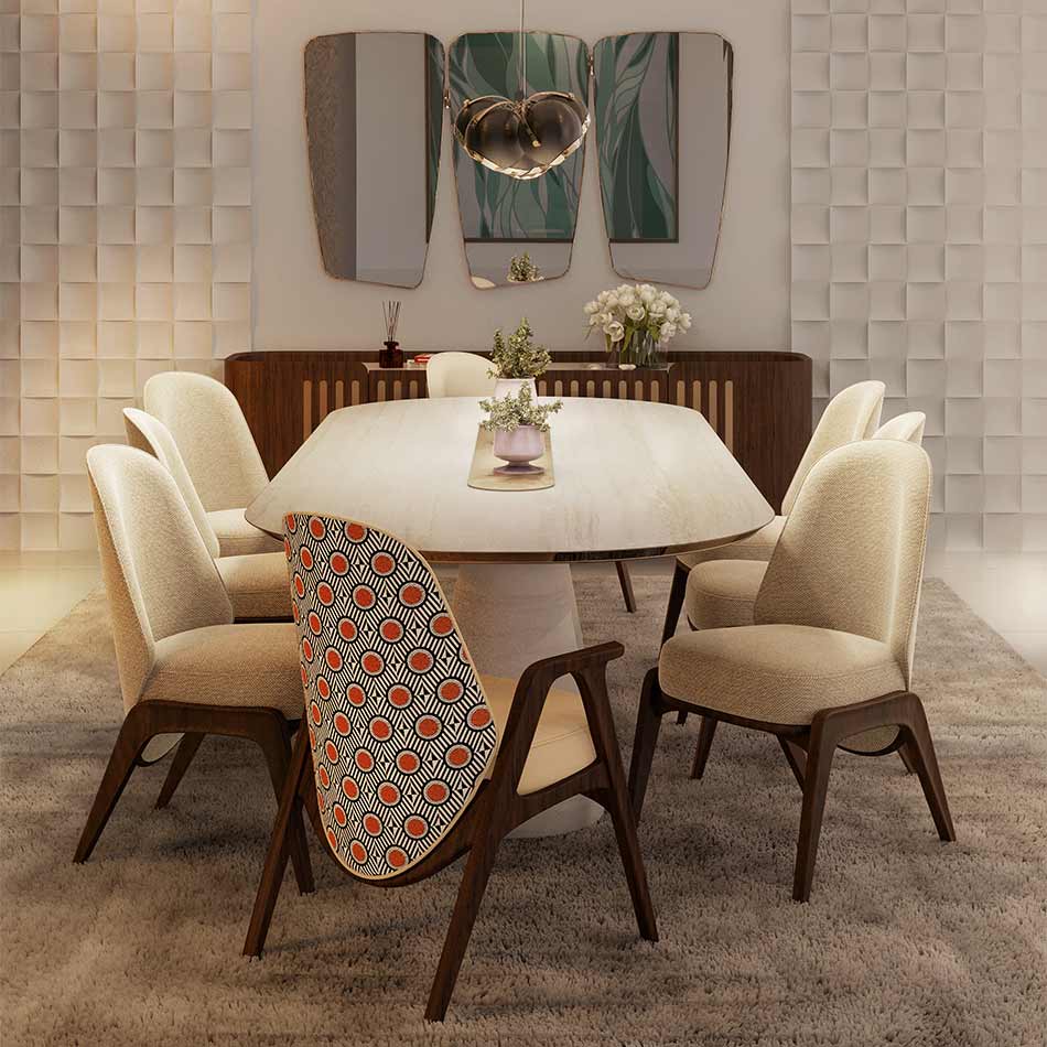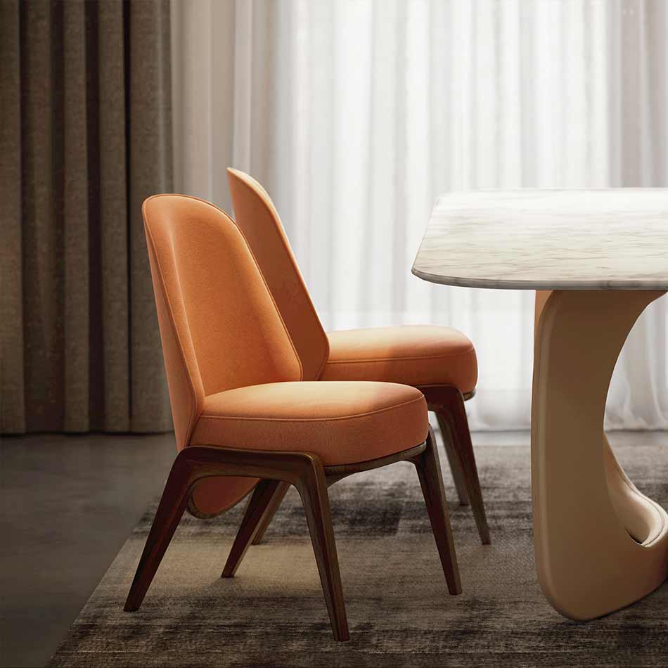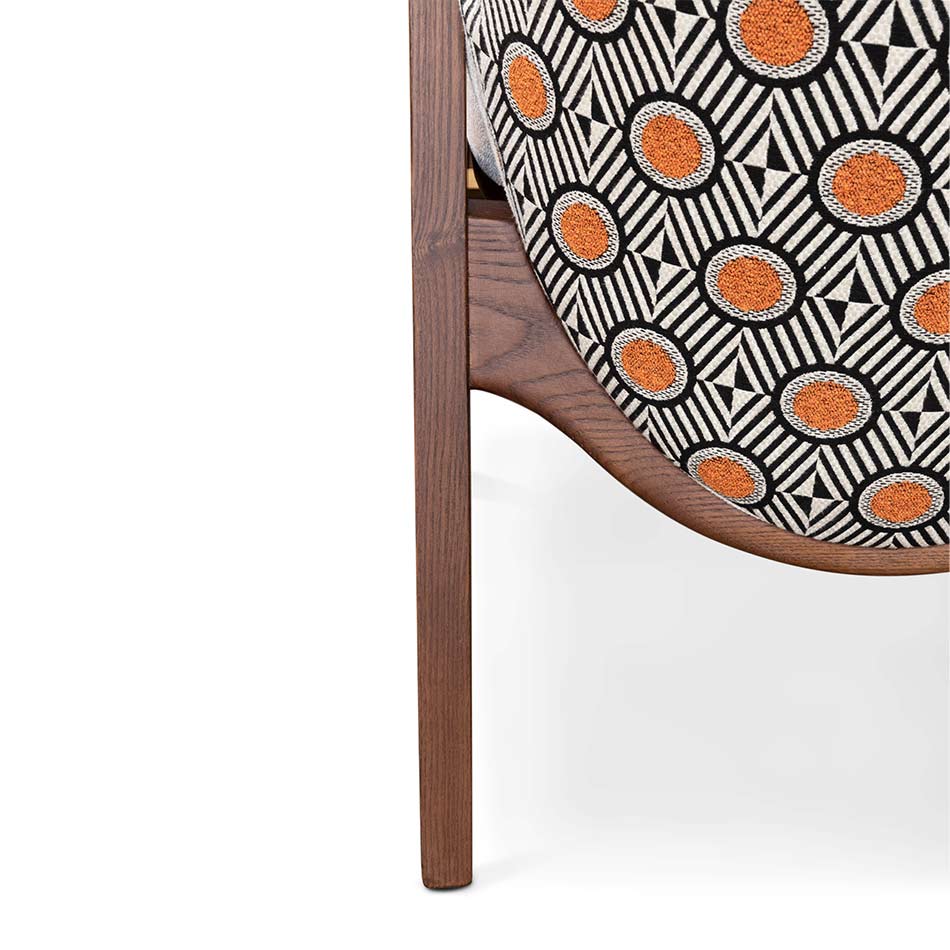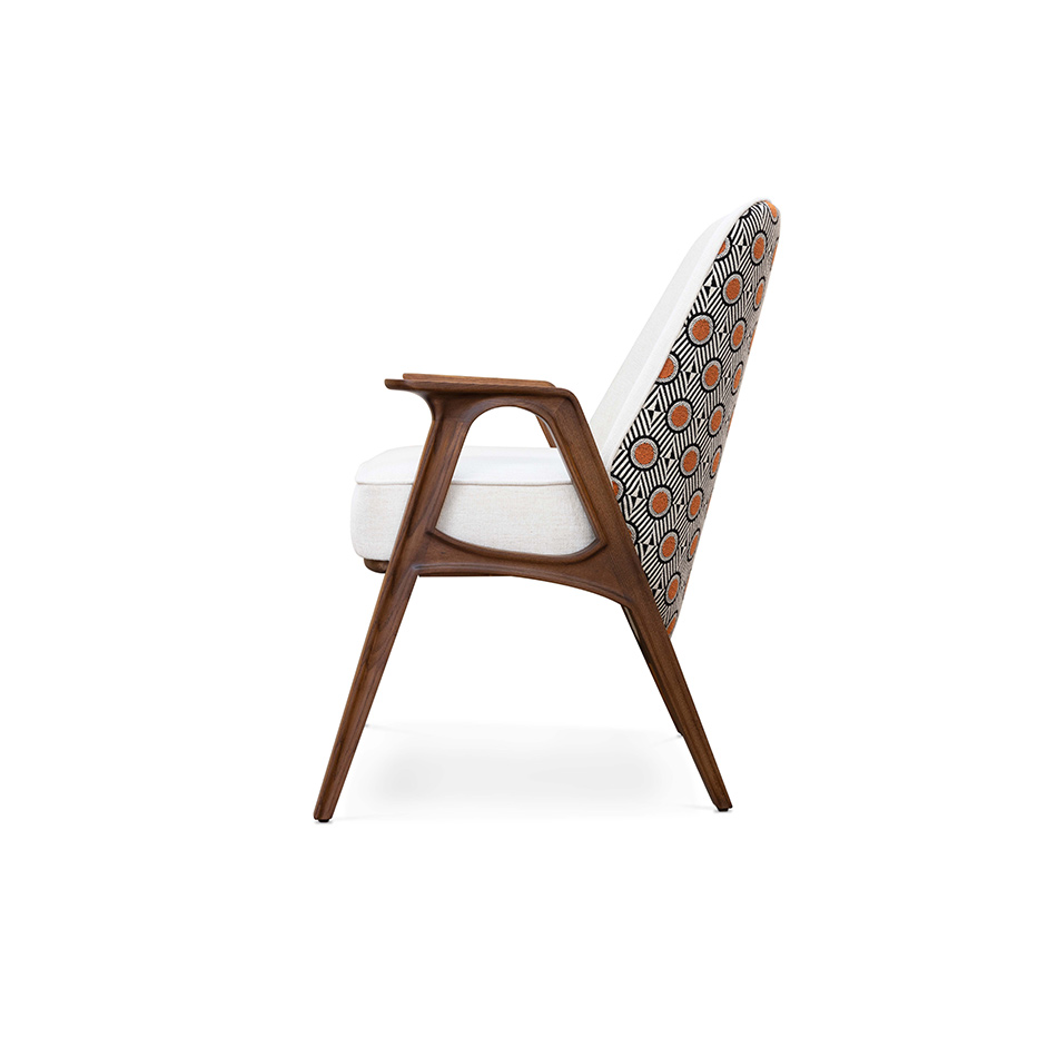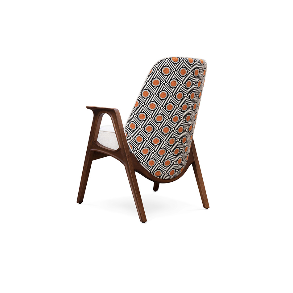 Like its family, Hadley chair reflects the best of the ’30s. A timeless and flawless design. Wooden legs and armrests pair wonderfully with a customizable fabric for the seat and an art deco pattern on the back. This versatile piece is the perfect fit for a lounge or hotel lobby, or even as an accent dining chair alongside its counterpart.