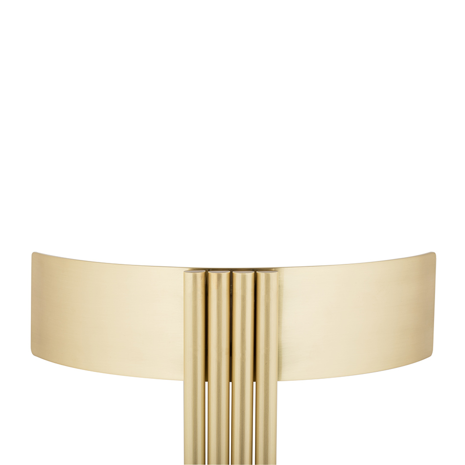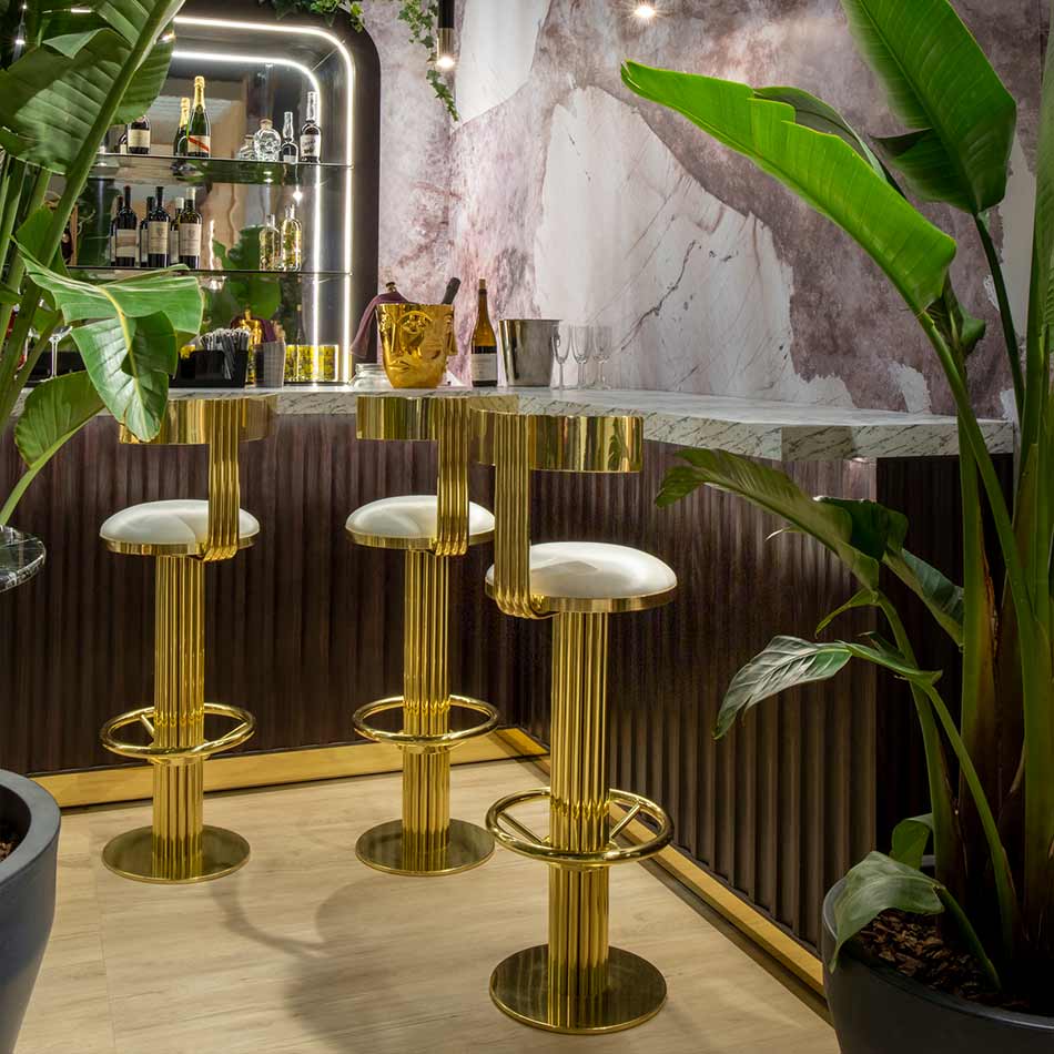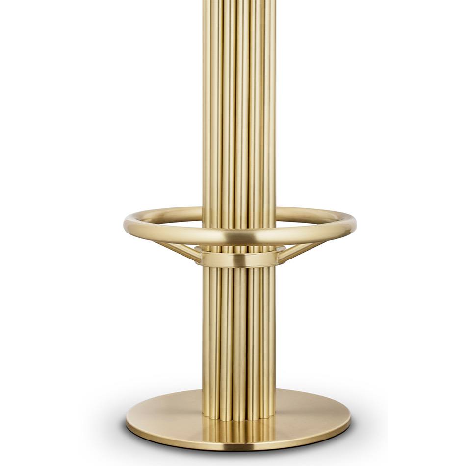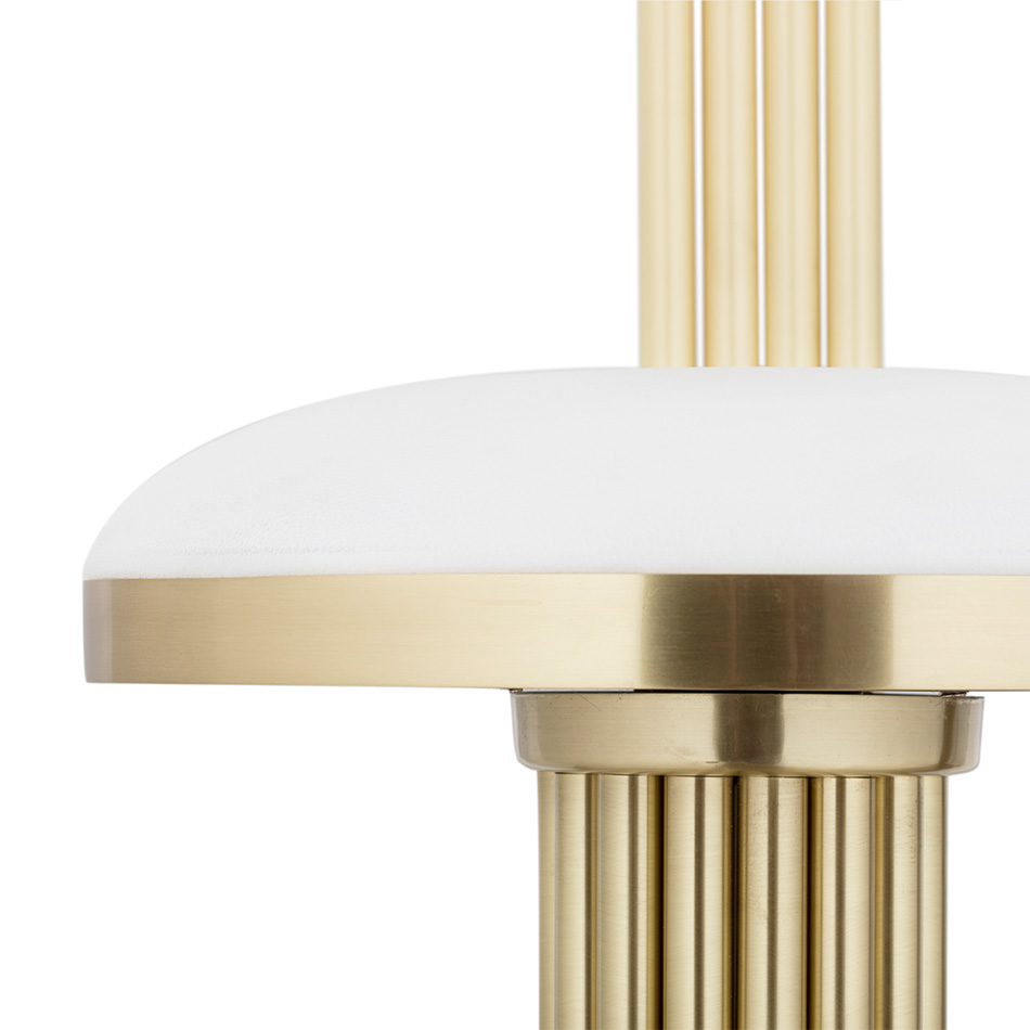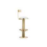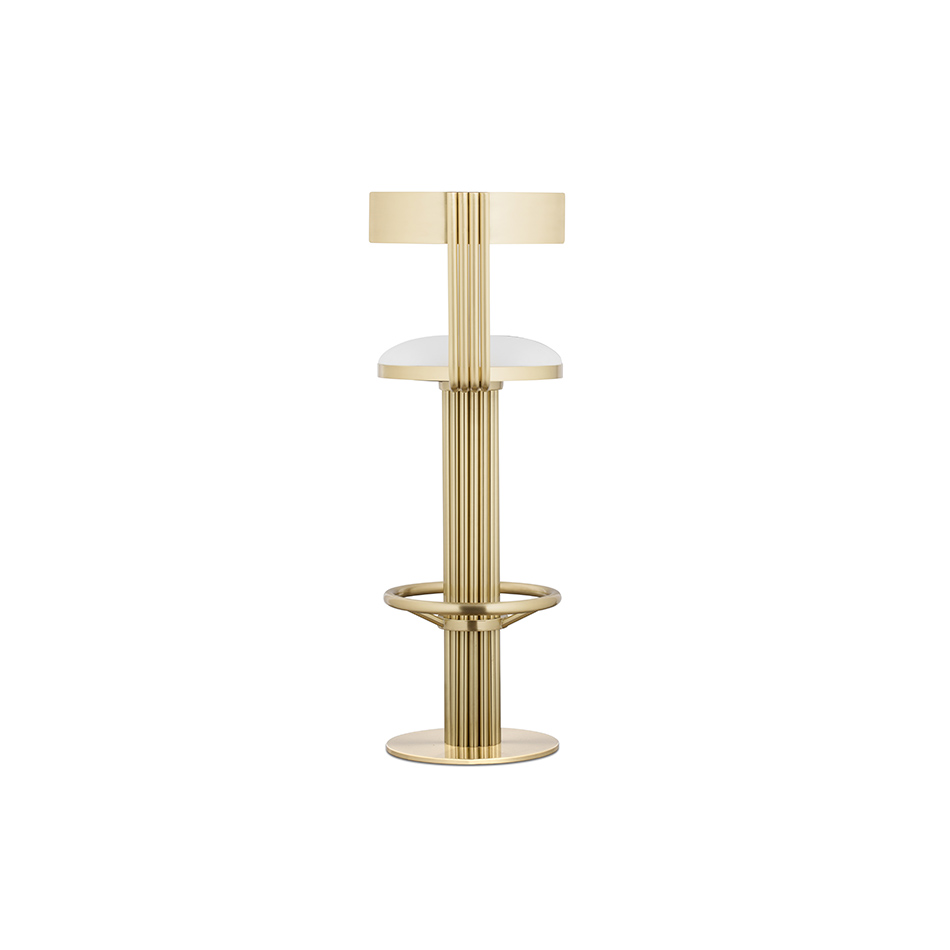 Inspired by the sculpted arches from the bar in the classic movie Casablanca, it’s a timeless and unforgettable piece. Besides being stylish, it is made to be comfortable and stand the test of time. The body is a full piece of polished brass that features a low back, a foot rail, and white leather on the seat.